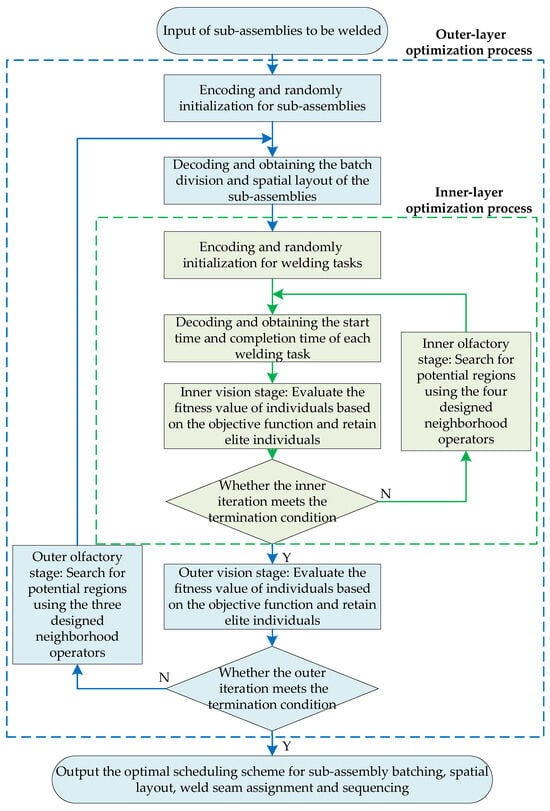 The main decision variables of this scheduling problem include sub-assembly batching, sub-assembly spatial layout, welding task assignment within batches, and welding task sequencing within batches. Among these, welding task assignment and sequencing can only be further optimized after determining the sub-assembly sequencing, batching, and spatial layout, resulting in the nested optimization characteristic of this problem. In summary, the scheduling problem of the automated sub-assembly welding line studied in this paper can be defined as a two-layer cyclic optimization problem: first, the outer layer optimizes the sub-assembly sequencing, batching, and spatial layout. Then, the inner layer further optimizes the welding task assignment and sequencing. Finally, the solution of the outer layer optimization is further adjusted based on the results of the inner layer optimization.