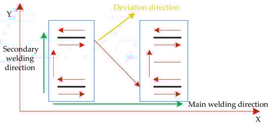 The x-axis of the sub-assembly workpiece coordinate system is arranged parallel to the length direction of the roller table. When the width of a workpiece perpendicular to the length direction of the roller table exceeds m, the welding tasks within m are performed by robots on the same side, while those beyond m are handled by robots on the opposite side. Therefore, when workpieces with a width exceeding m are placed in the welding area, the x-axis of their workpiece coordinate system must also be parallel to the length direction of the roller table. For workpieces with a width less than m, the x-axis of their workpiece coordinate system is usually placed parallel to the length direction of the roller table but can also be placed arbitrarily. In addition, the robot has a 200 mm margin in the width direction of the roller table (Y-direction), meaning that if the distance between the x-axis of the workpiece and the edge of the track is within 200 mm, the robot can compensate for it; otherwise, due to the arm span limitation, the robot cannot compensate for this distance deviation, resulting in a failure to perform the intended welding tasks.