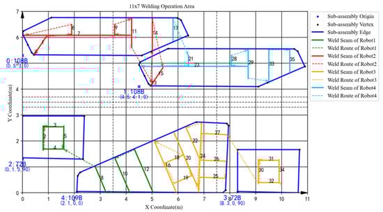 Improving robot welding efficiency is the current main demand of enterprises, so this study takes minimizing the total completion time as the objective function. The analysis of the automated sub-assembly welding line reveals that sub-assemblies are placed in batches in the work area for welding. Therefore, it is initially essential to take into account the batching and spatial layout of sub-assemblies with various shapes. Subsequently, for batches of sub-assemblies, their welding tasks need to be assigned to four sets of cantilever welding robots, and their welding sequence must be determined in the limited work area, as shown in Figure 4. These four sets of cantilever welding robots could be deemed analogous to parallel processing machines, so this scheduling problem can be classified as the parallel machine scheduling problem. However, unlike traditional parallel machine scheduling problems, equipment interference between robots must be considered during the operation of the four parallel welding robots.