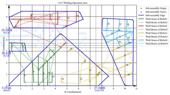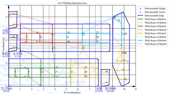 (2) The transfer time of sub-assembly batches into and out of the automated welding area is neglected in the model. Based on on-site data, the average transfer time is 30 s, accounting for only 0.67–1% of a batch’s completion time (3000–4500 s). This negligible proportion has minimal impact on scheduling accuracy, while simplifying the model to focus on core layout and task allocation.