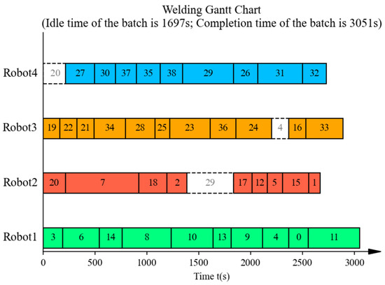 In the production process of sub-assemblies, the welding station, as a bottleneck link, requires that the four welding robots can participate in the sub-assembly welding process to the maximum extent. Therefore, the objective function of this paper is to minimize the total completion time, as presented in Equation (1).