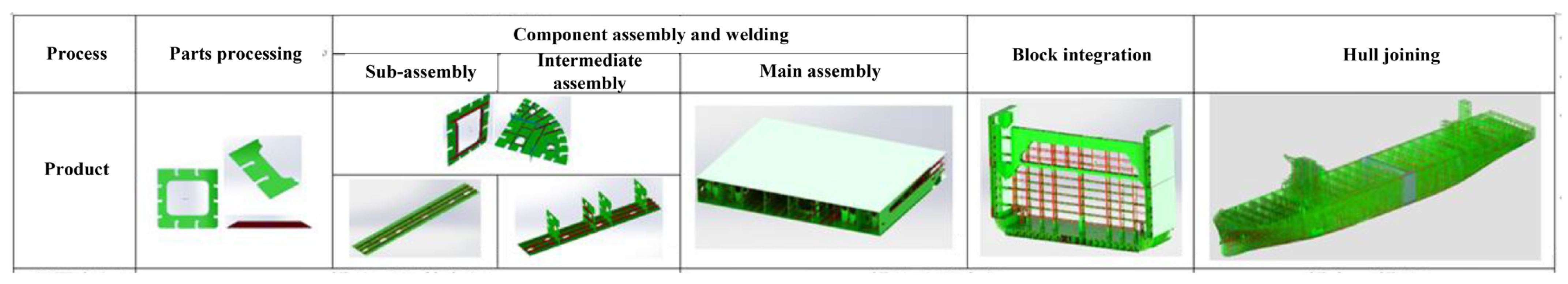 Modern shipbuilding enterprises adopt a segmented production model based on group technology and are oriented towards intermediate products, which are gradually manufactured and integrated into ship products. As shown in