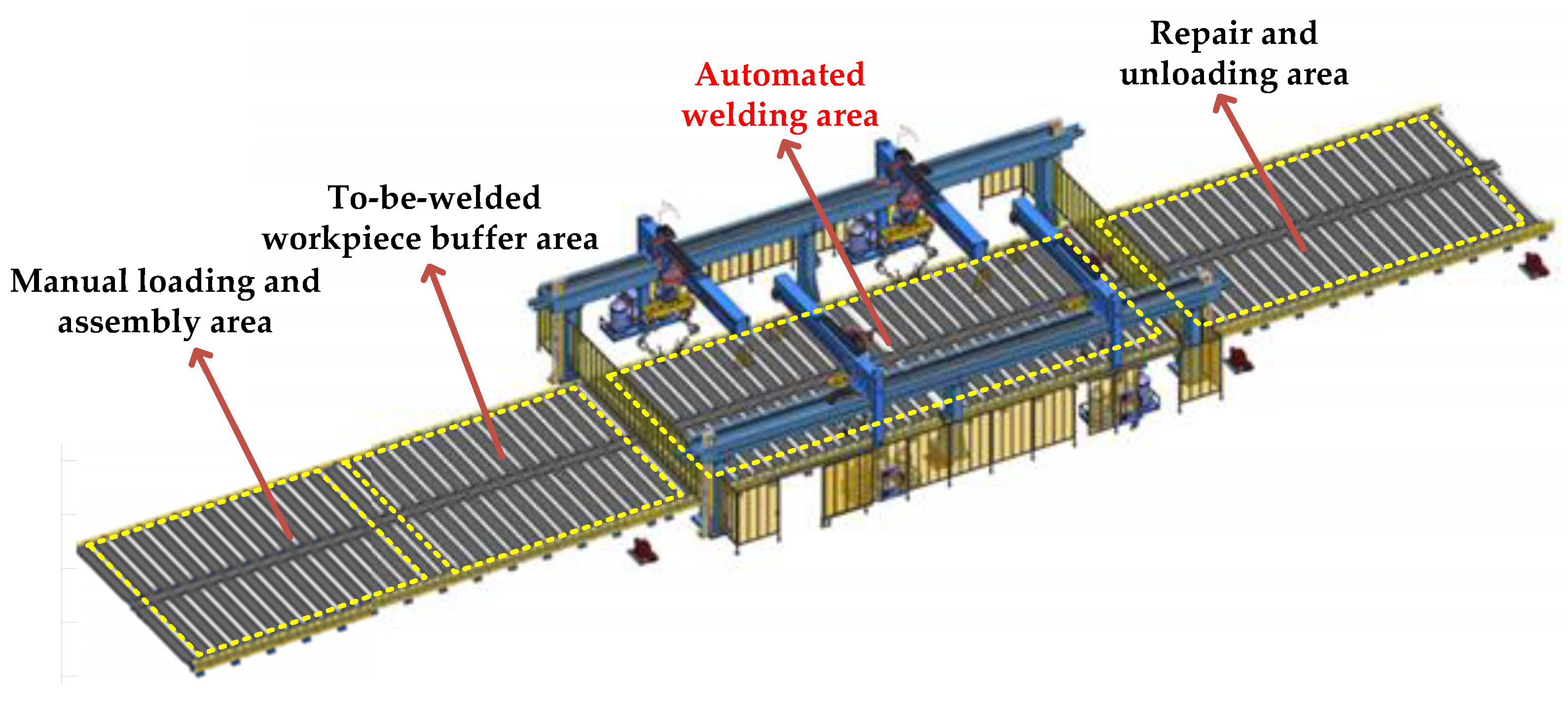 Figure 2 shows an automated sub-assembly welding line built in the component workshop of a shipyard, which consists of four areas: a manual loading and assembly area, a to-be-welded workpiece buffer area, an automated welding area, and a repair and unloading area. At first, components are manually transported to assembly stations for assembly work. After assembly, the components are sequentially conveyed to buffer stations and welding stations via the roller table system, where robots automatically identify and weld them to form sub-assemblies. And then, the sub-assemblies are transported to repair and grinding stations through the roller table system. Eventually, the sub-assemblies after repair and grinding are moved out of the line by workers.