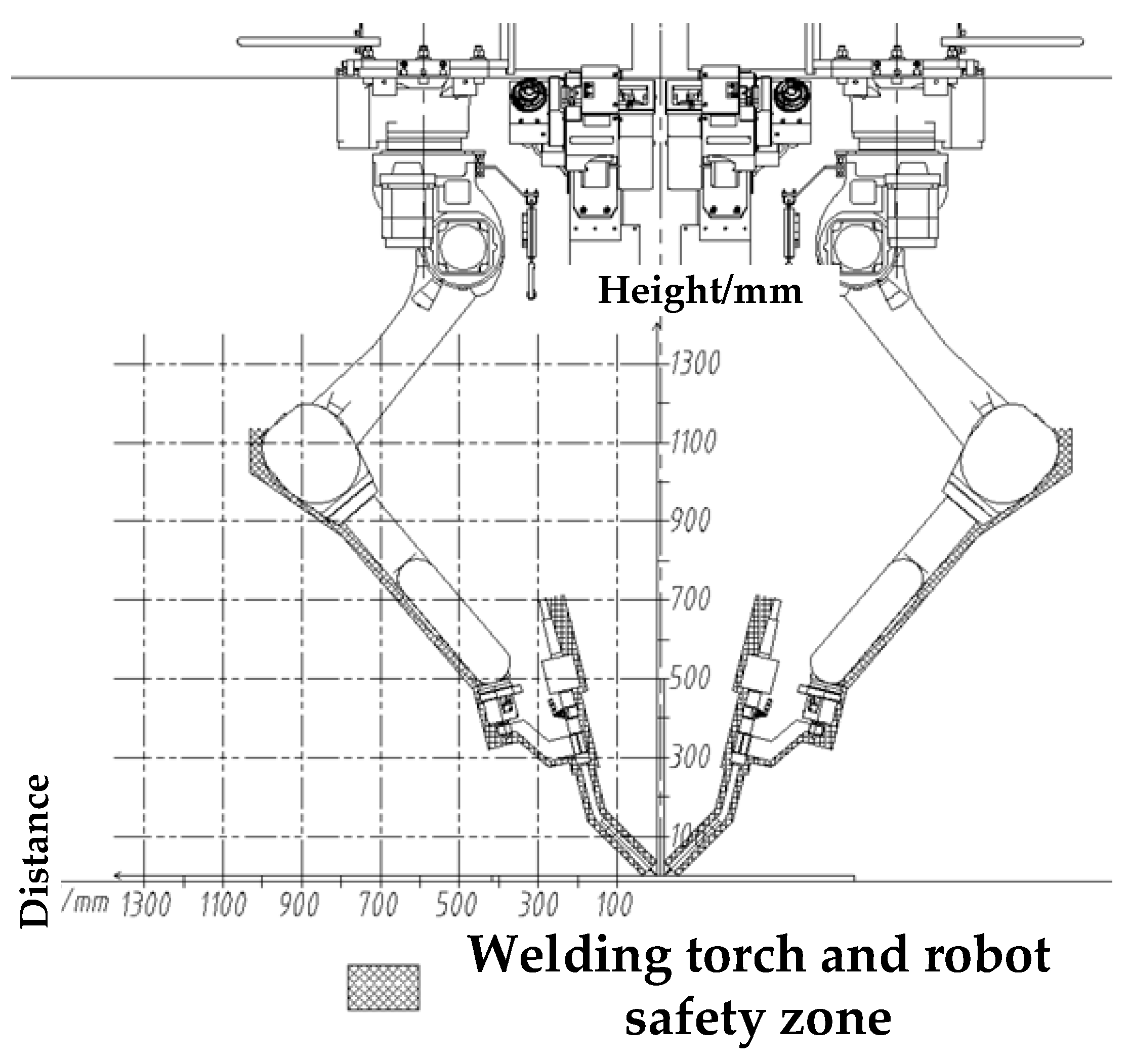 Based on their arrangement on both sides of the roller table, the four sets of cantilever systems can be divided into same-side cantilever systems and opposite-side cantilever systems. The same-side cantilever systems share a common track and can perform collaborative welding on workpieces within the welding reachable area along the track. Due to the limitations of arm span and track, the opposite-side cantilever systems can only handle welding tasks for workpieces within m in the Y-direction. It can be inferred that when welding workpieces with a width greater than m, the two sets of opposite-side cantilevers can collaborate on welding the workpiece. When welding workpieces with a width within m, the four sets of cantilever systems can be split into four independent cantilever welding systems for separate welding, and the entire production line can be divided into two independent upper and lower production lines for operation. The line is suitable for workpieces with a maximum height of 1 m and a maximum vertical welding height of 550 mm.