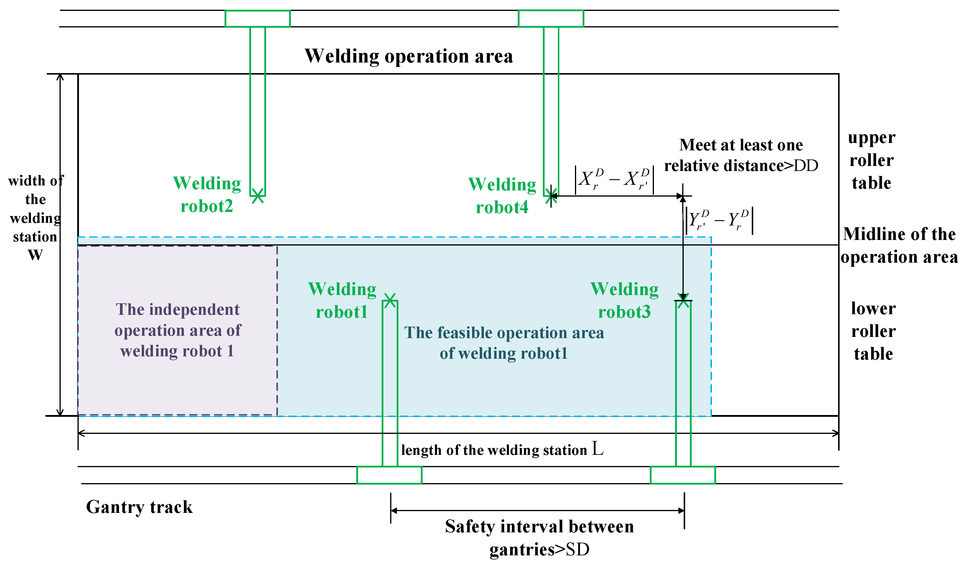 Figure 4. These four sets of cantilever welding robots could be deemed analogous to parallel processing machines, so this scheduling problem can be classified as the parallel machine scheduling problem. However, unlike traditional parallel machine scheduling problems, equipment interference between robots must be considered during the operation of the four parallel welding robots.