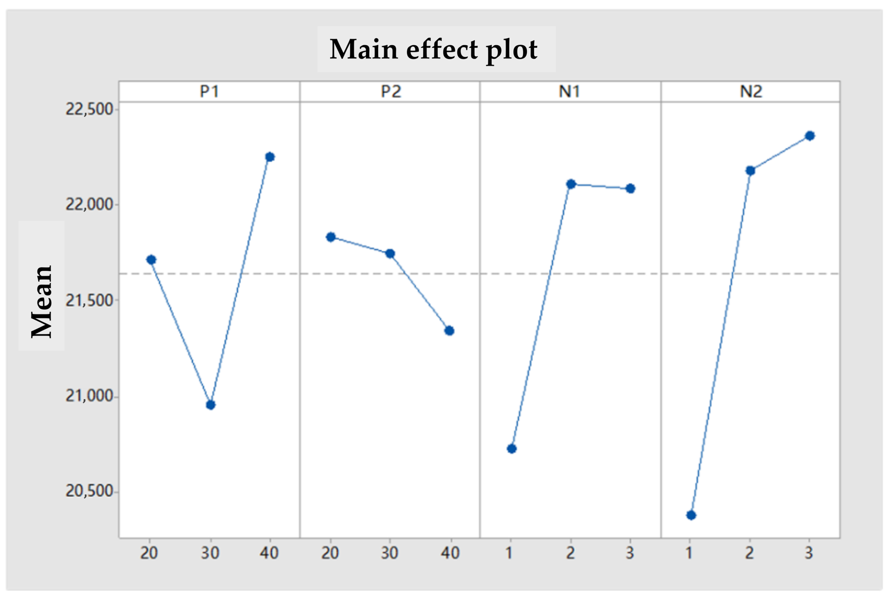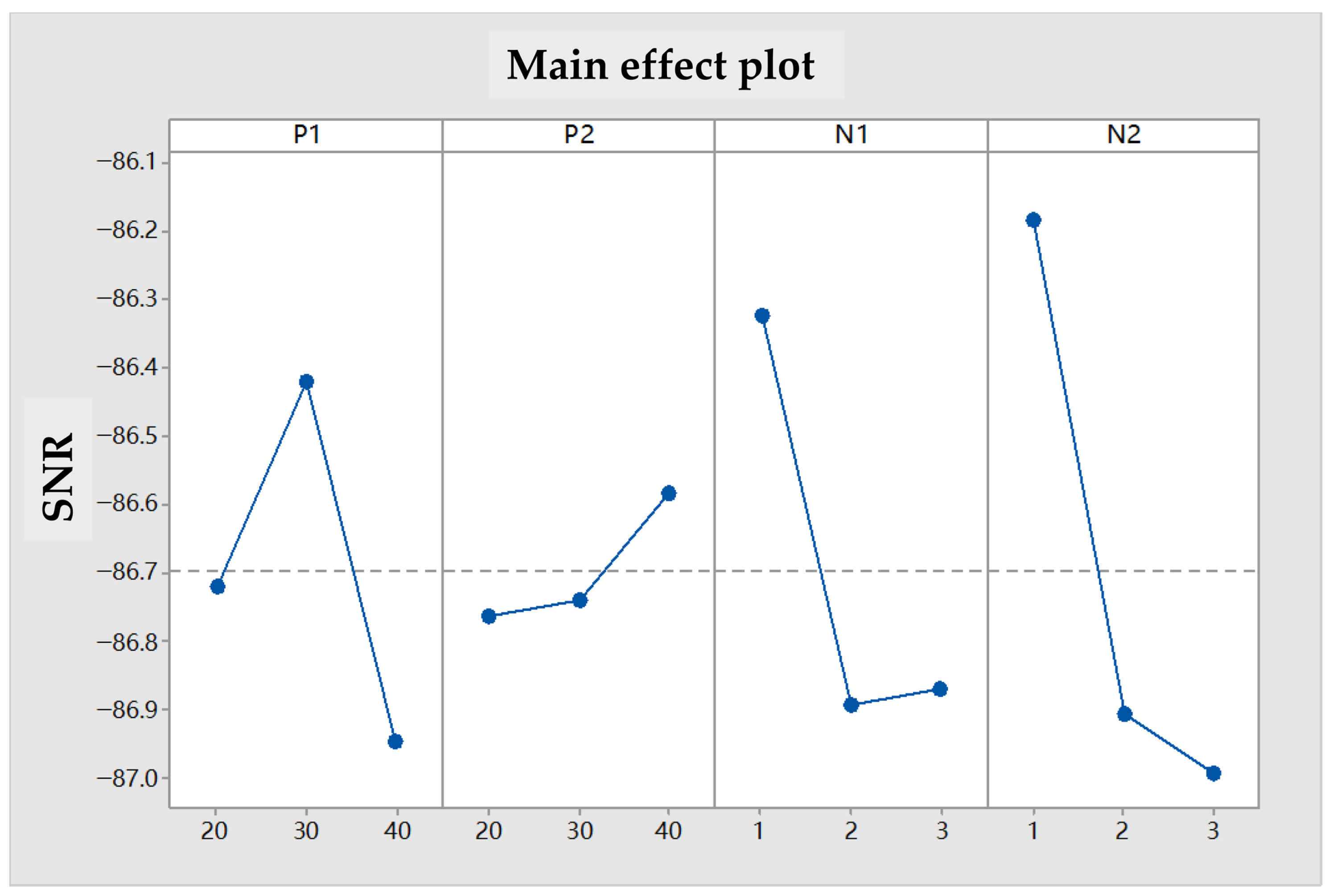 Eventually, the main effect plots of the mean value and signal-to-noise ratio are shown in