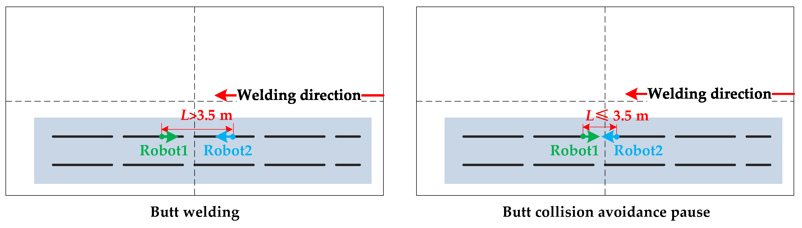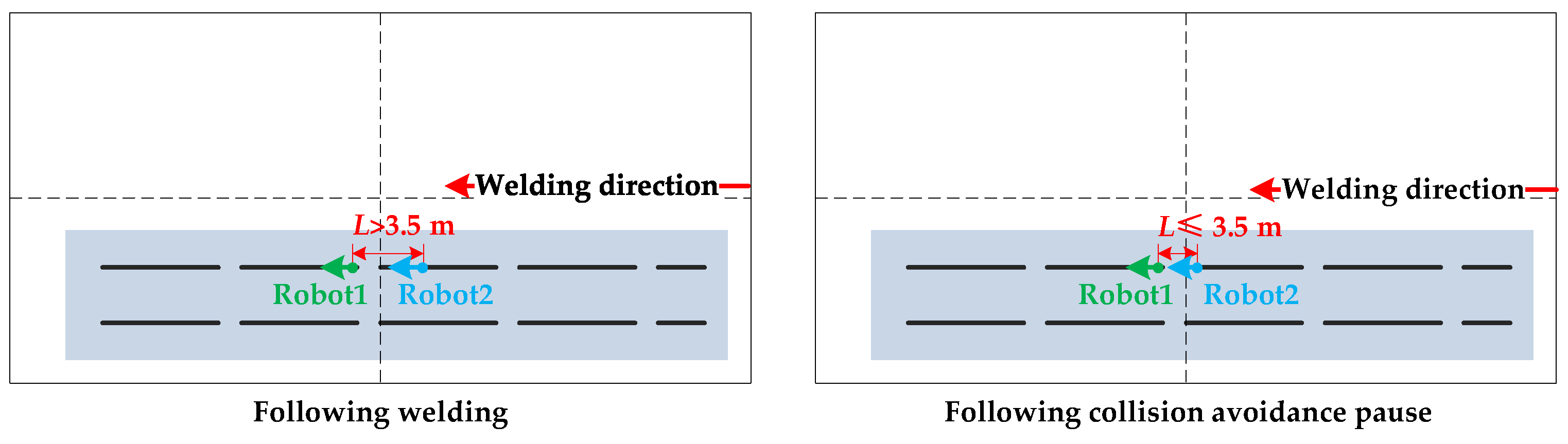 (1) Following collision avoidance strategy: When welding in the same direction, if the distance between the two robots is greater than m, they can perform following welding; otherwise, the robots will pause for safety reasons and wait for manual handling.