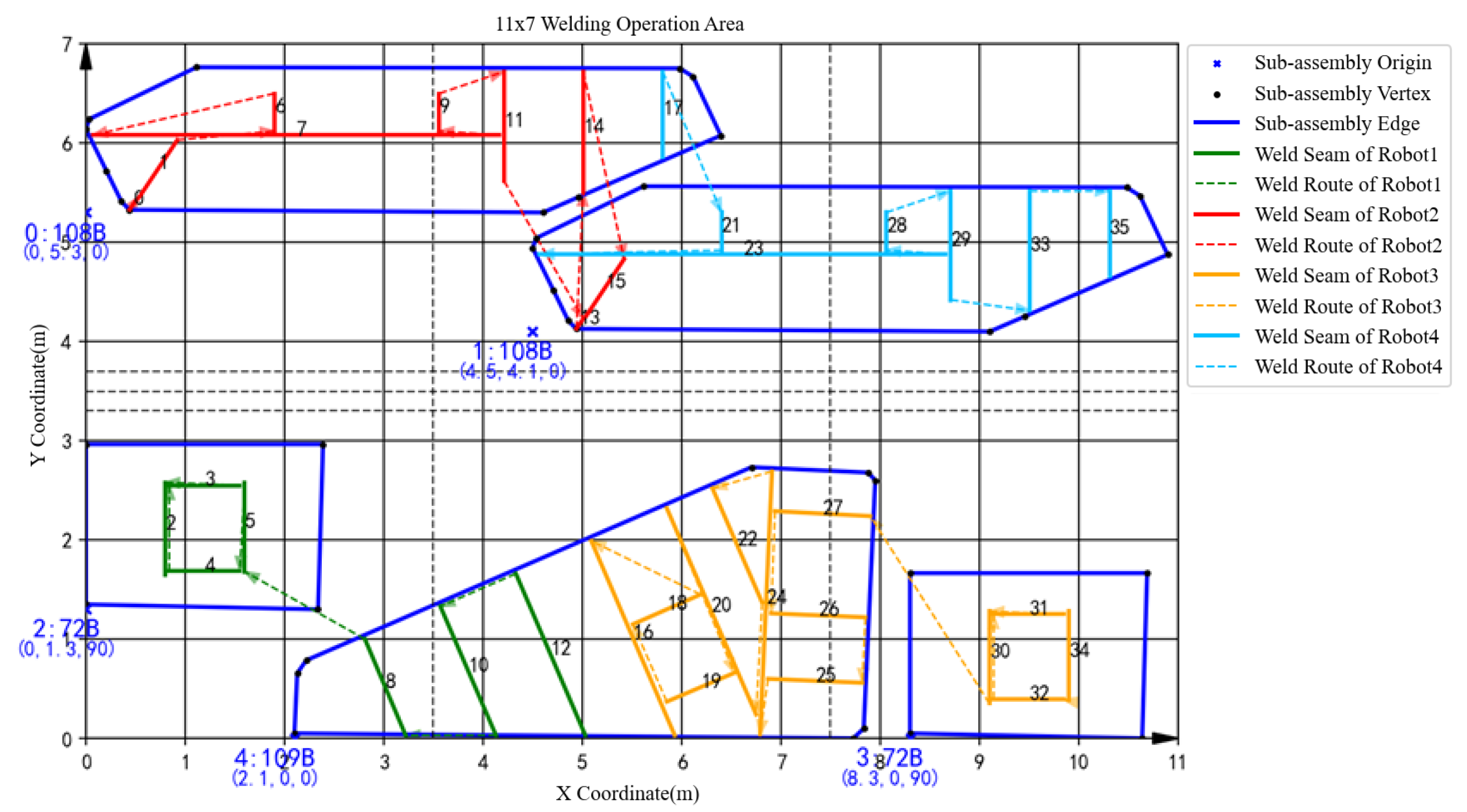 Figure 13), sub-assembly 108B is placed transversely, resulting in most welding tasks being assigned to the lower half. This causes robots 1 and 3 to bear longer welding tasks, leading to unbalanced robot loads during weld scheduling. Meanwhile, the transverse placement of the longest welding task (task 21) results in processing interference with multiple other welding tasks. As illustrated in