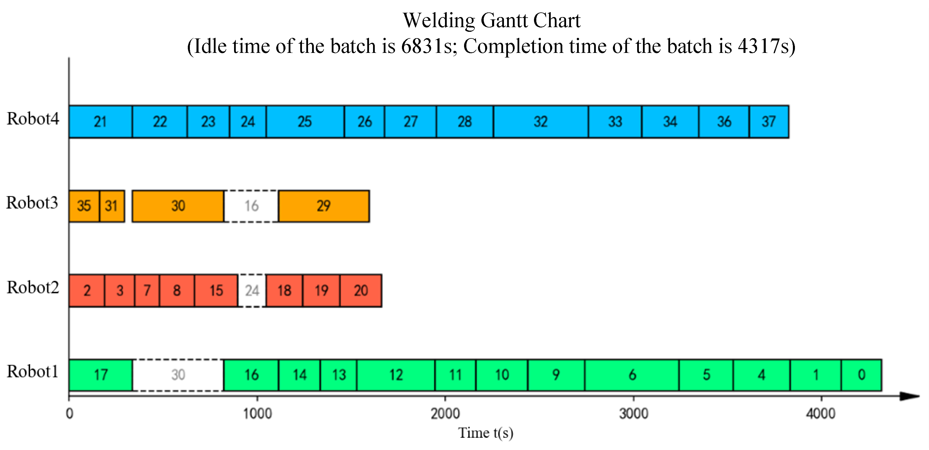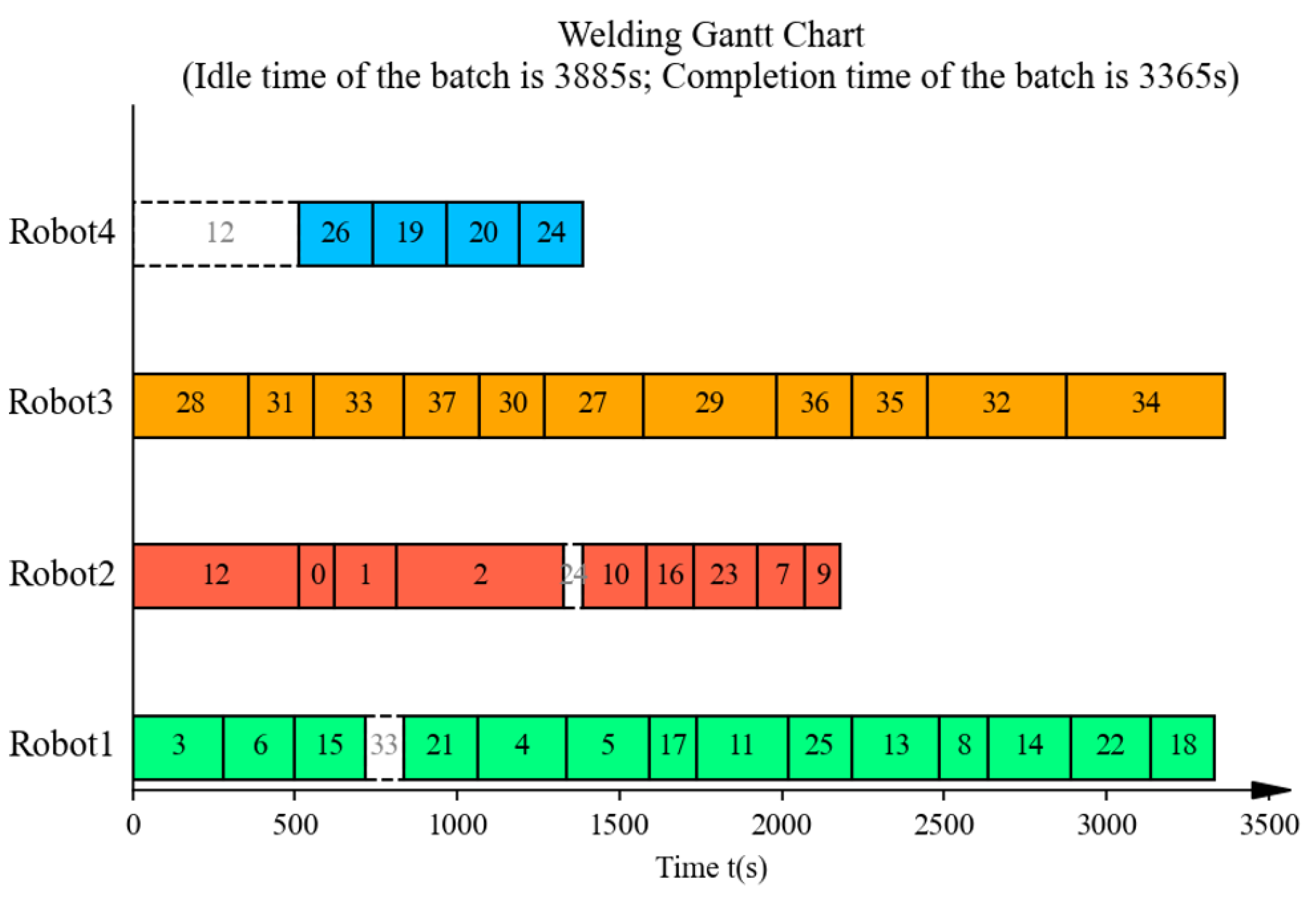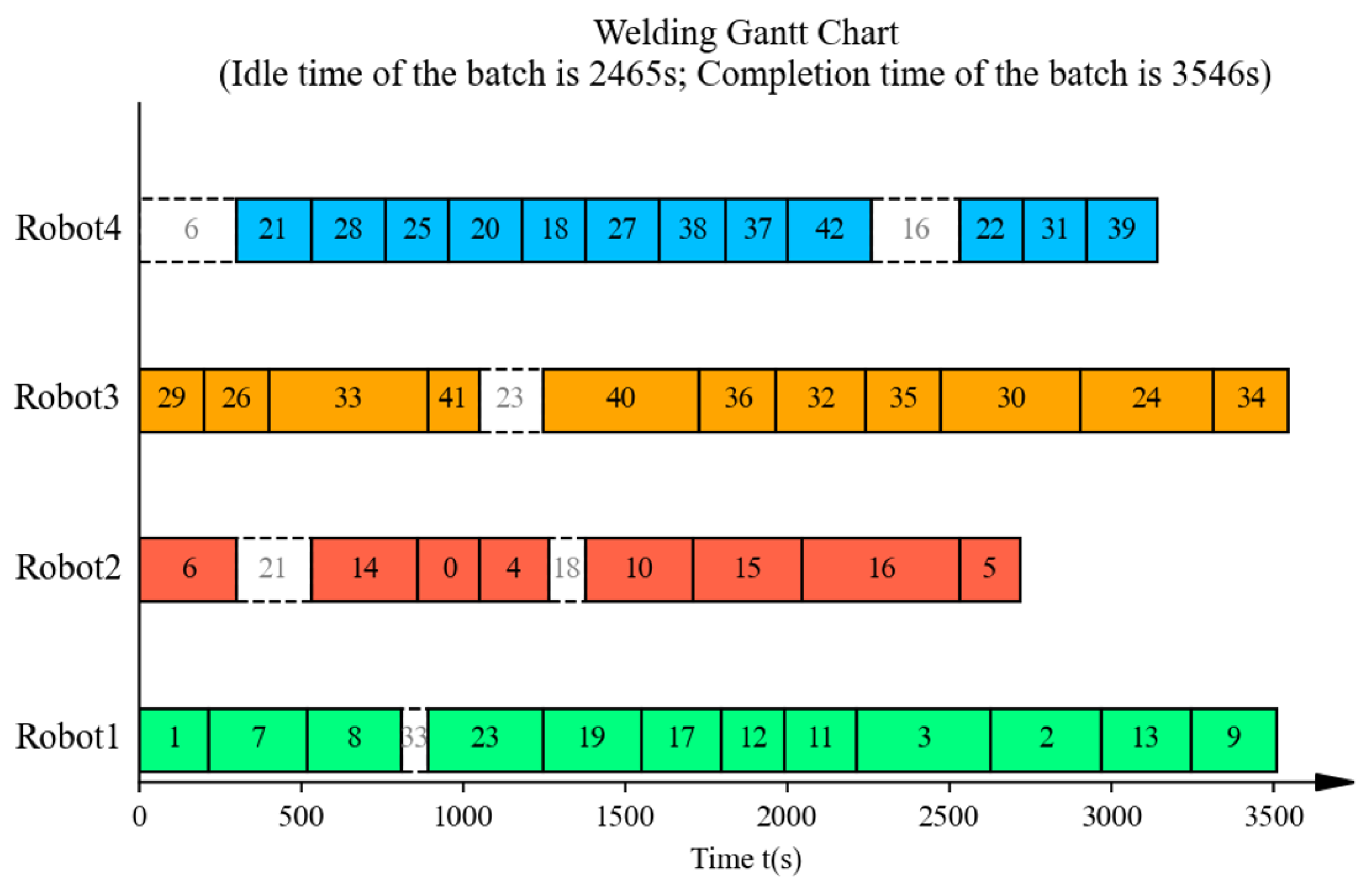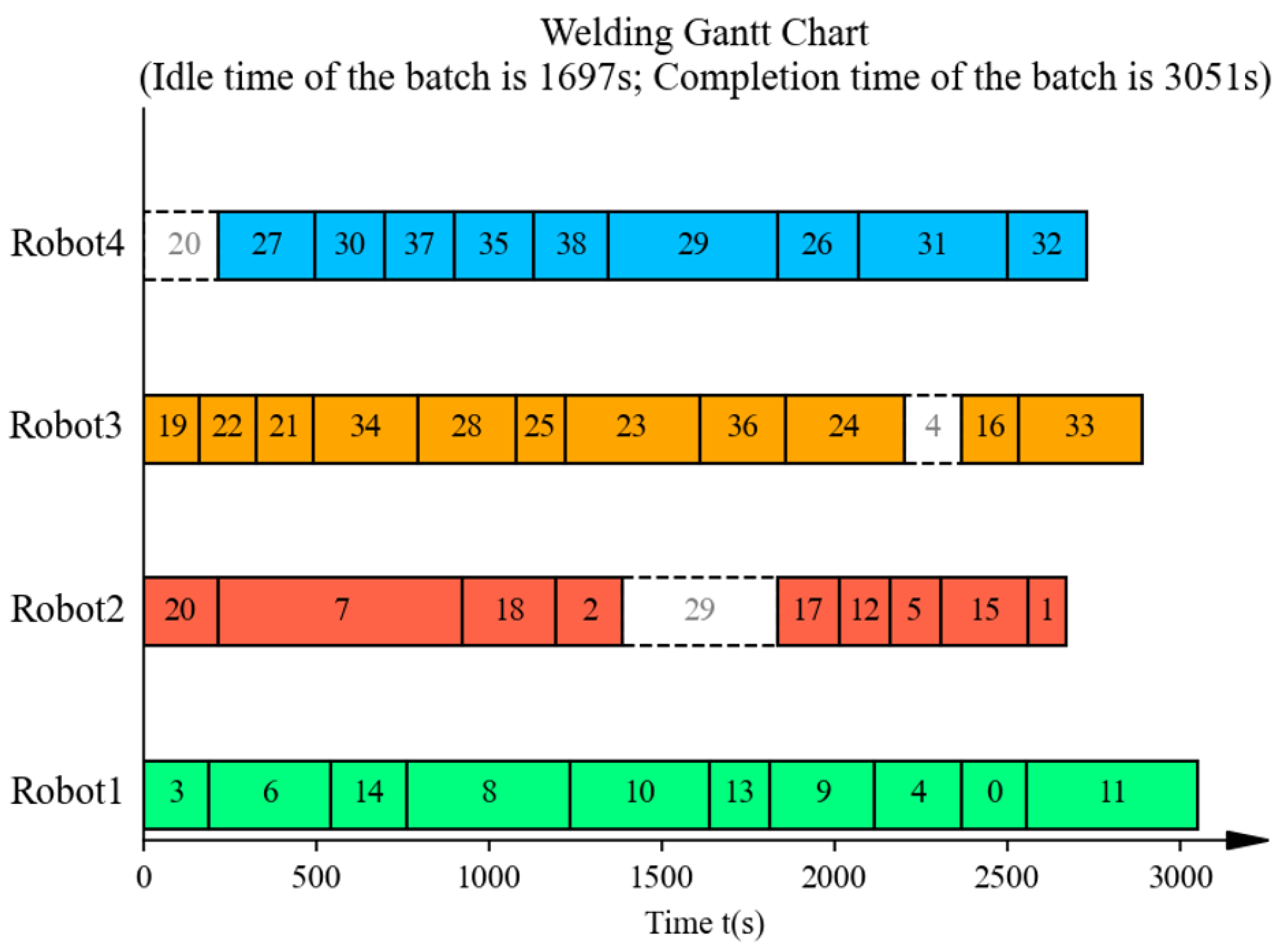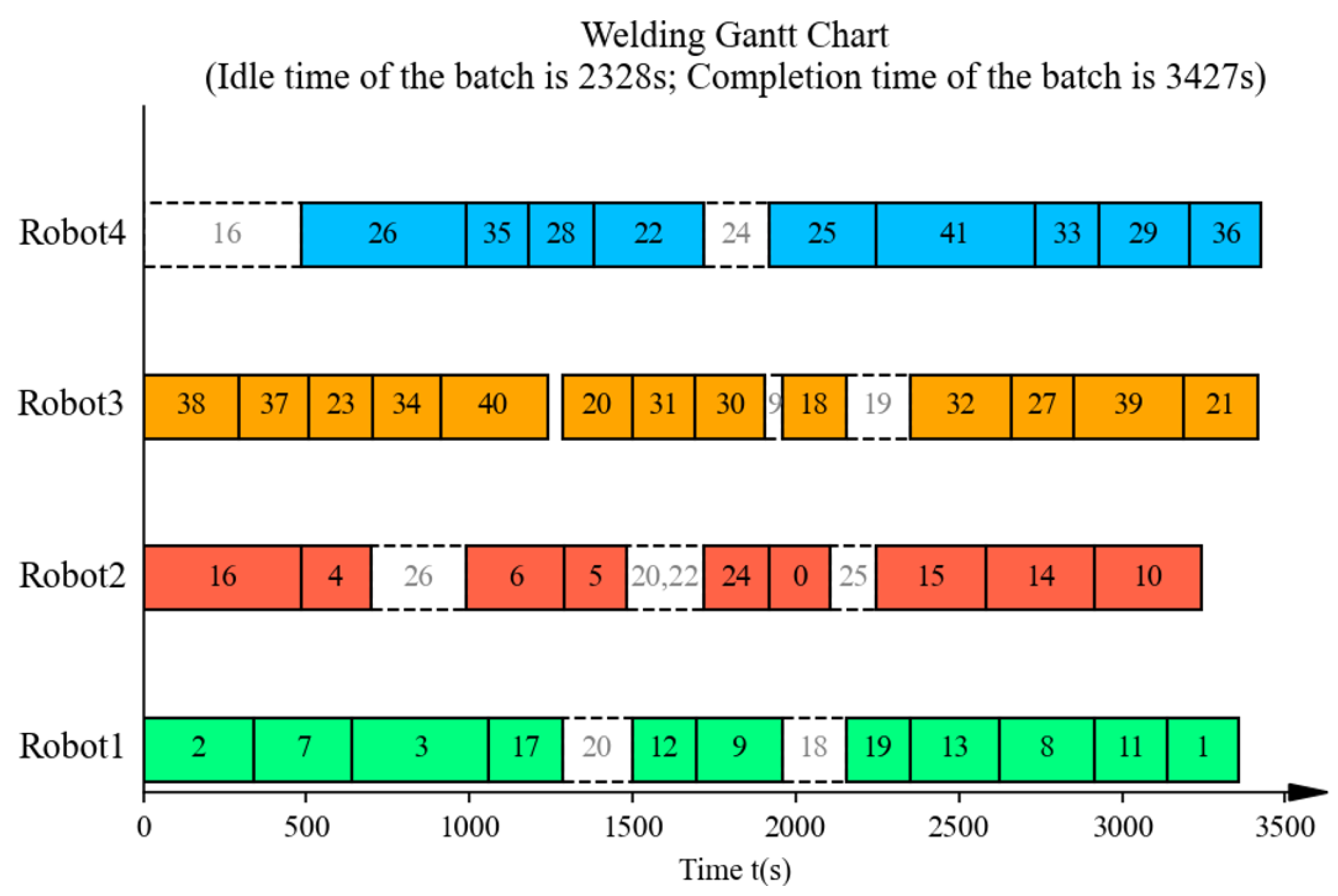 Figure 14, welding task 21 forces both robots 3 and 1 to experience prolonged waiting times, further extending the completion time of robot 1. Collectively, these two factors result in the longer completion time of batch 2 in the manual scheduling results. It fully demonstrates the effectiveness of the heuristic rules for spatial layout proposed in the ITLFOA.
