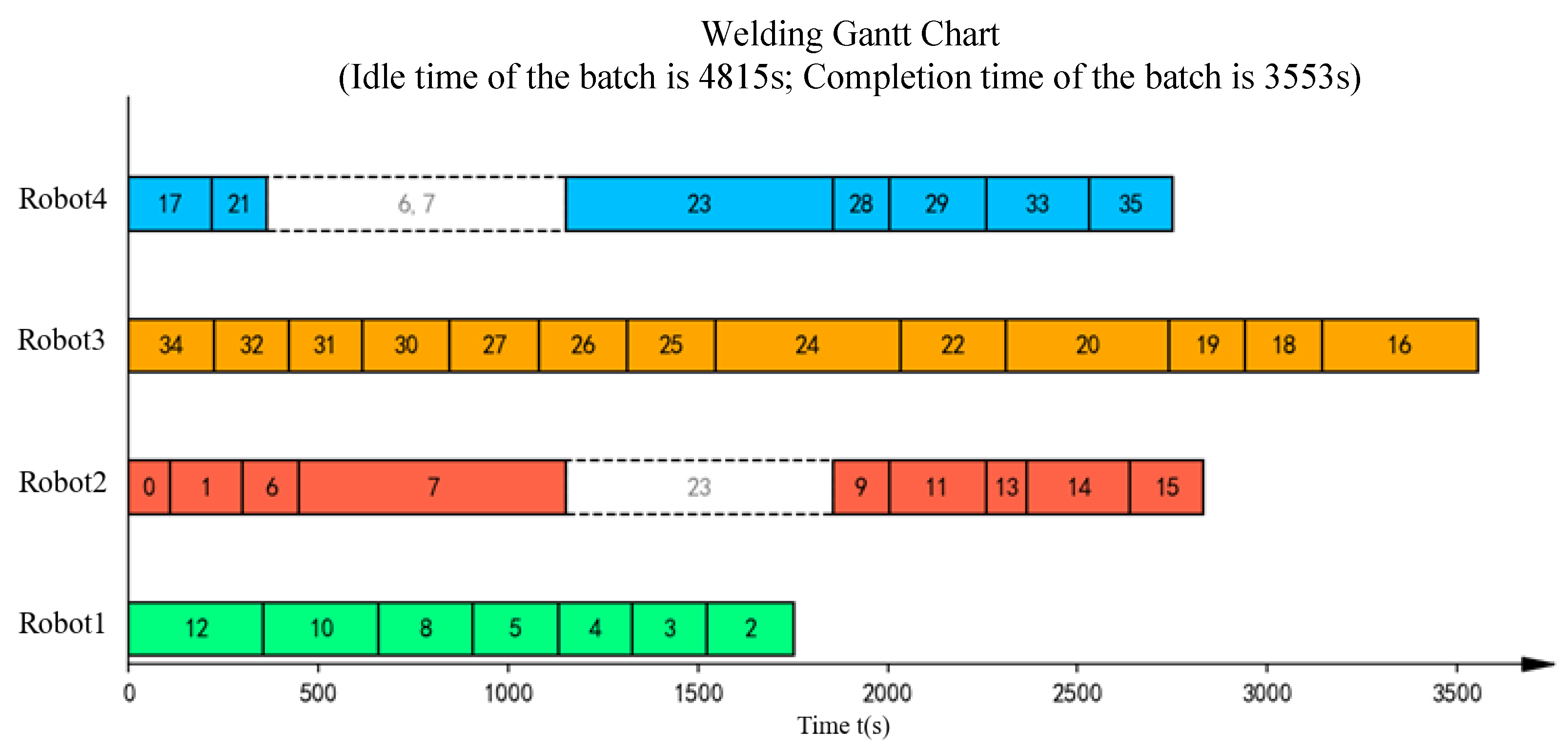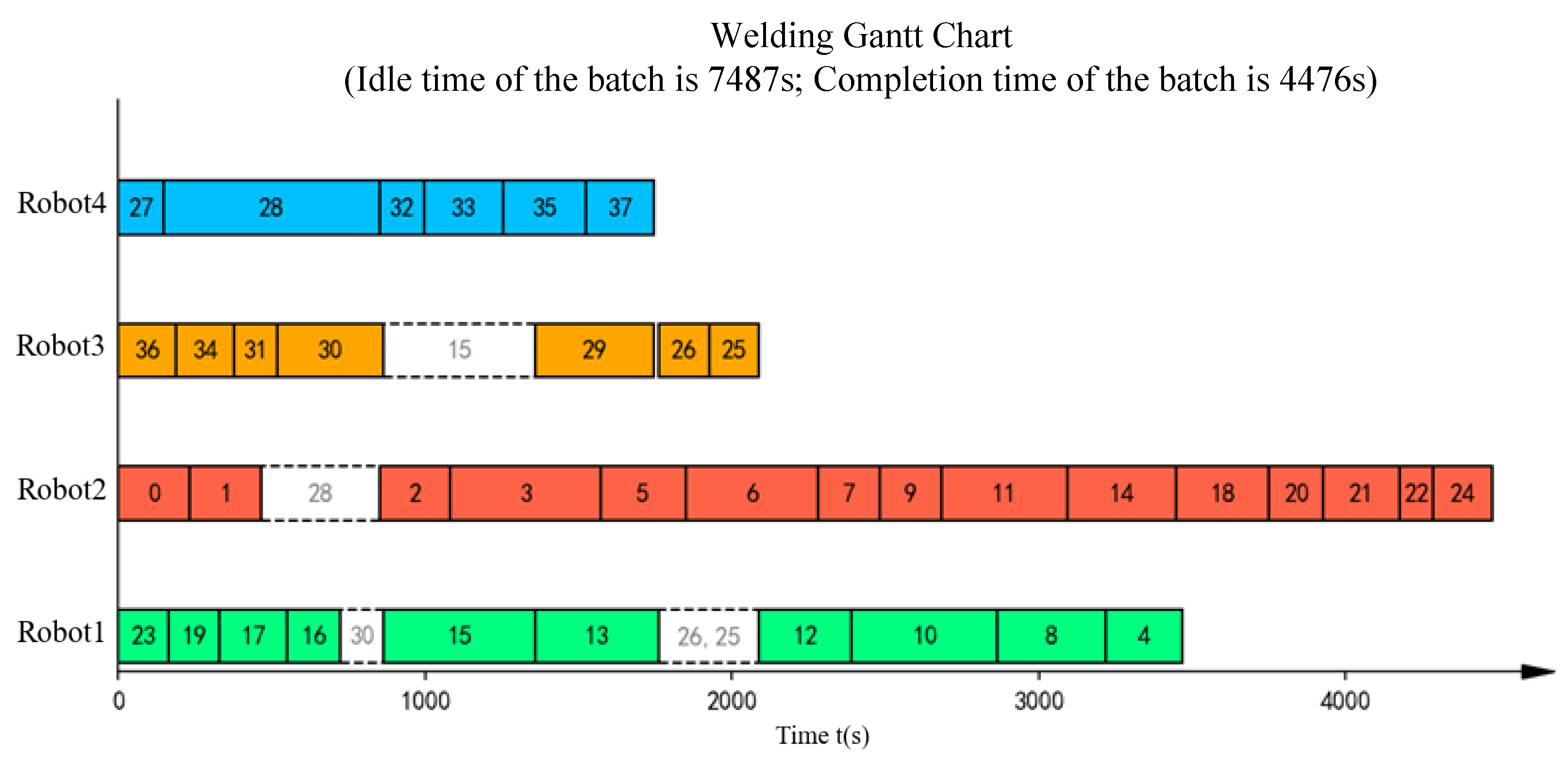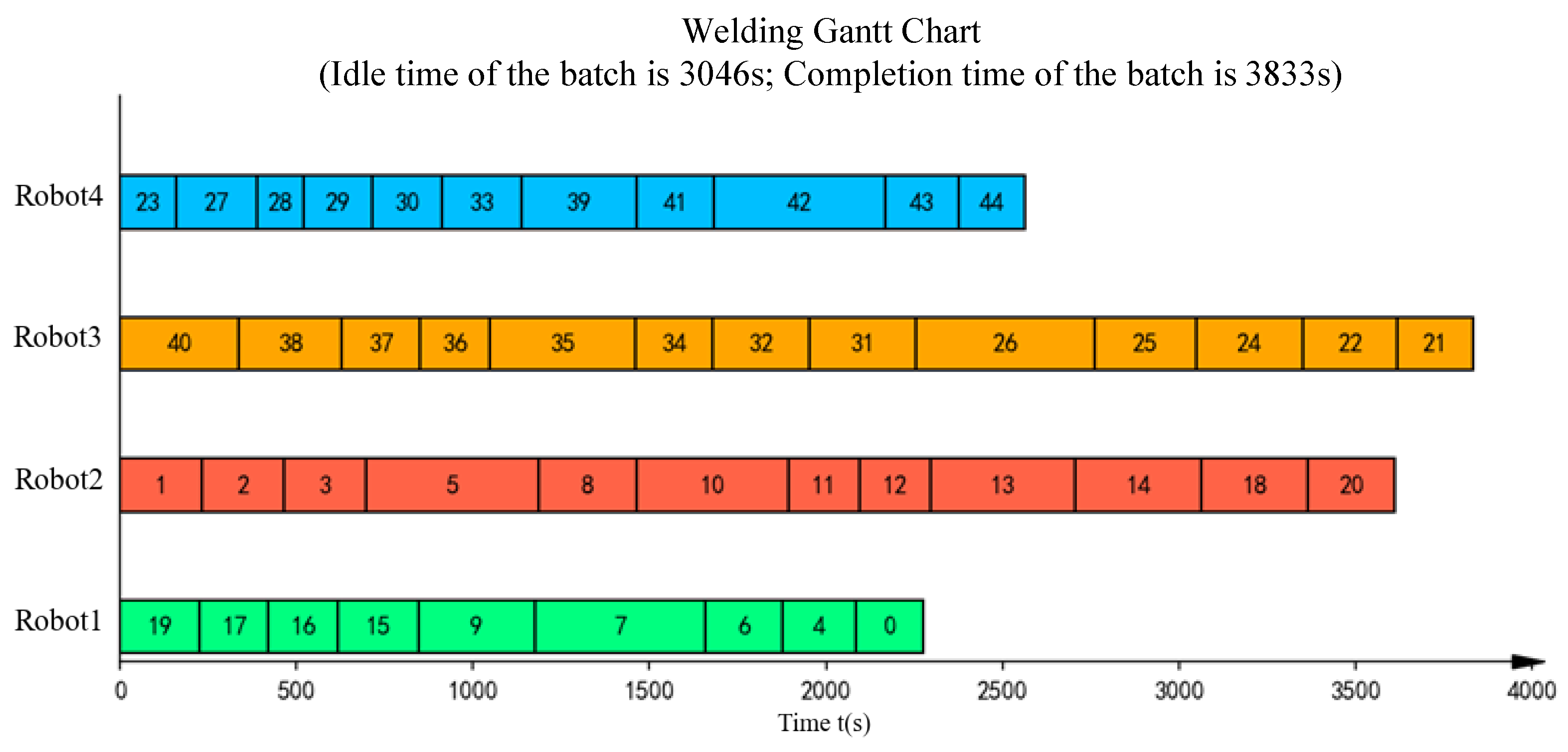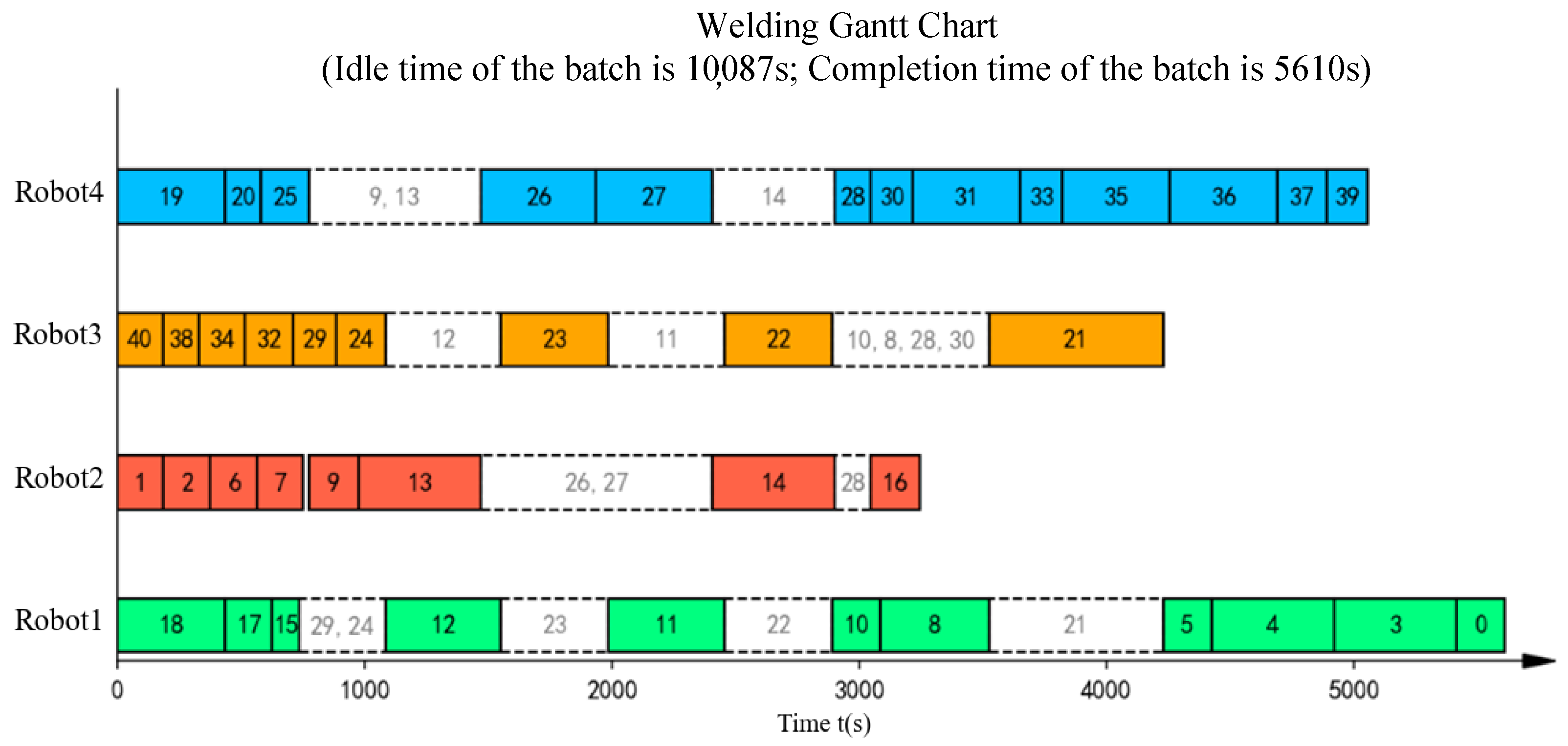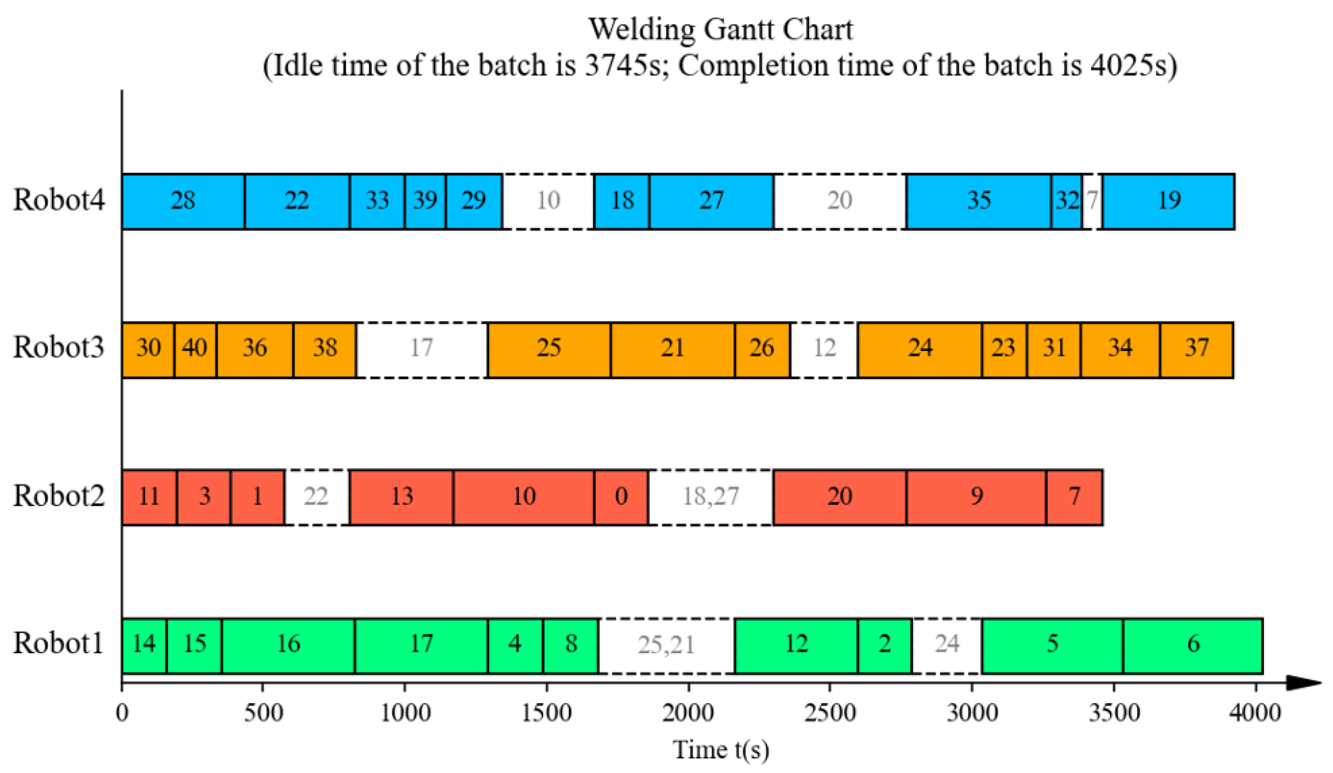 Figure 14, welding task 21 forces both robots 3 and 1 to experience prolonged waiting times, further extending the completion time of robot 1. Collectively, these two factors result in the longer completion time of batch 2 in the manual scheduling results. It fully demonstrates the effectiveness of the heuristic rules for spatial layout proposed in the ITLFOA.