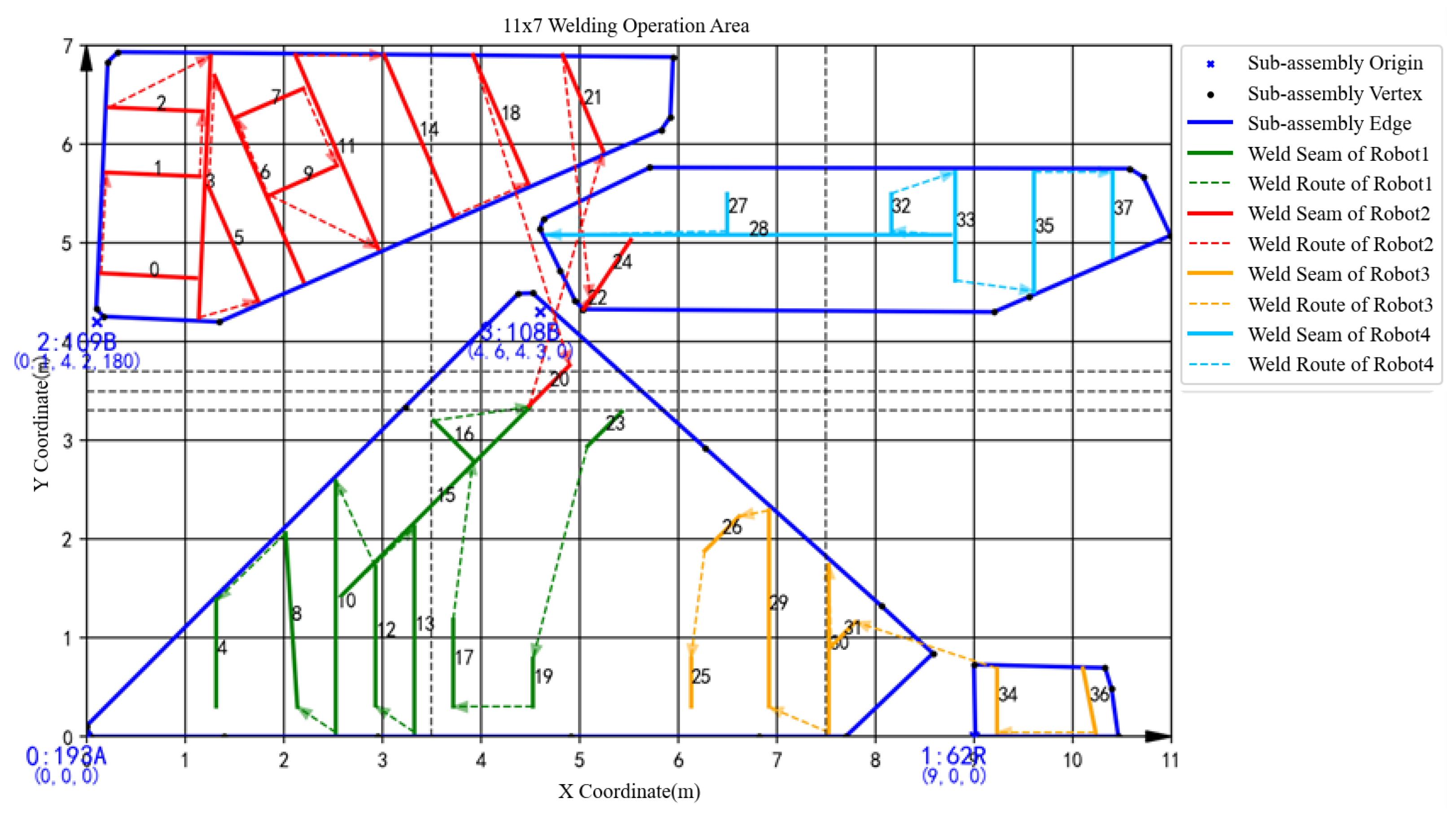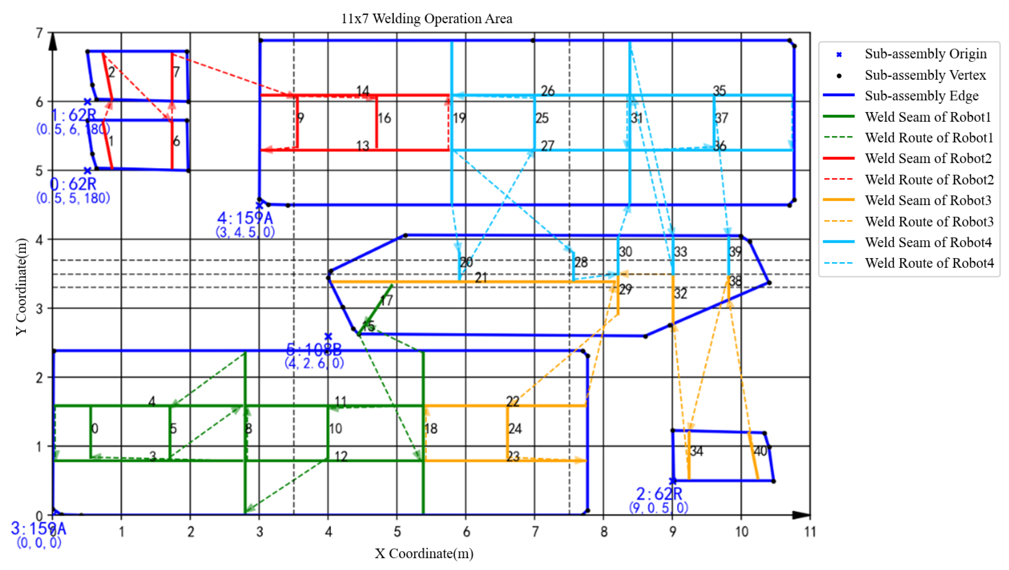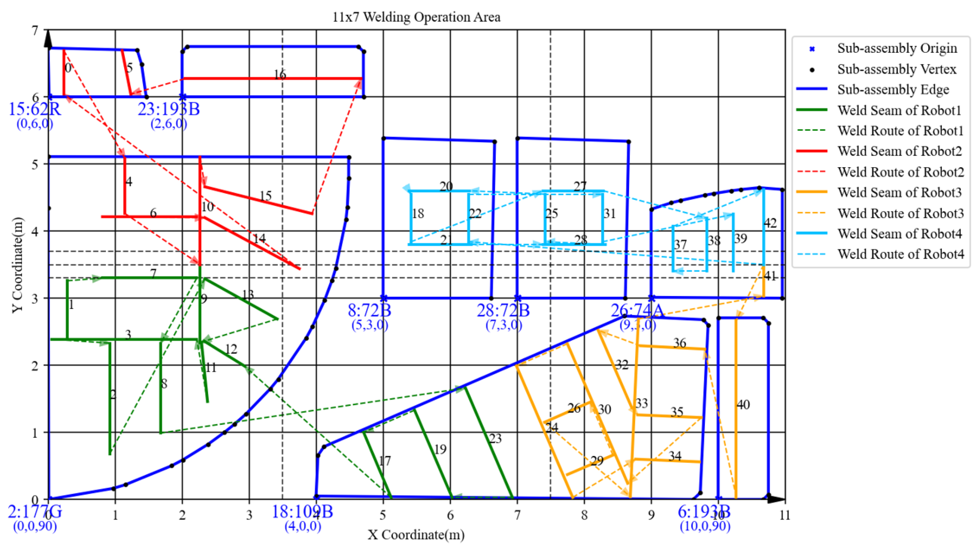 This paper uses partial data from a shipyard to form a solution case. The baseline case includes 30 sub-assemblies , the space size is . The safety distance between welding robots on the same side is 3.5 , the safety distance between welding robots on opposite sides is 3 , and the additional working distance in the Y-direction for welding robots at the junction of the upper and lower rollers is 0.2 .