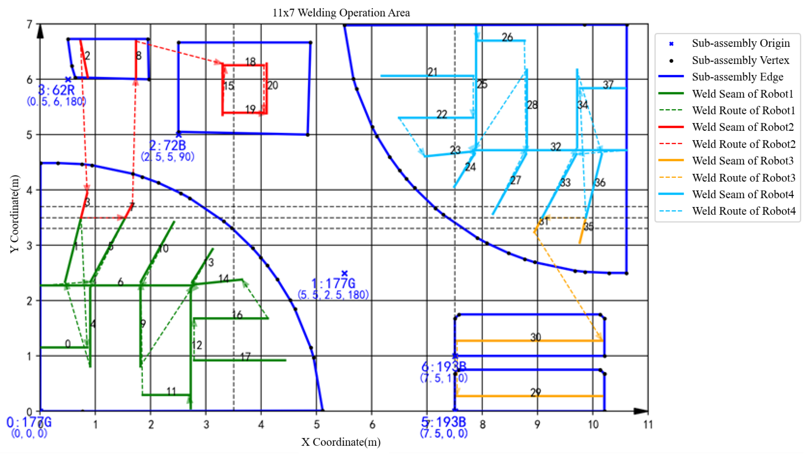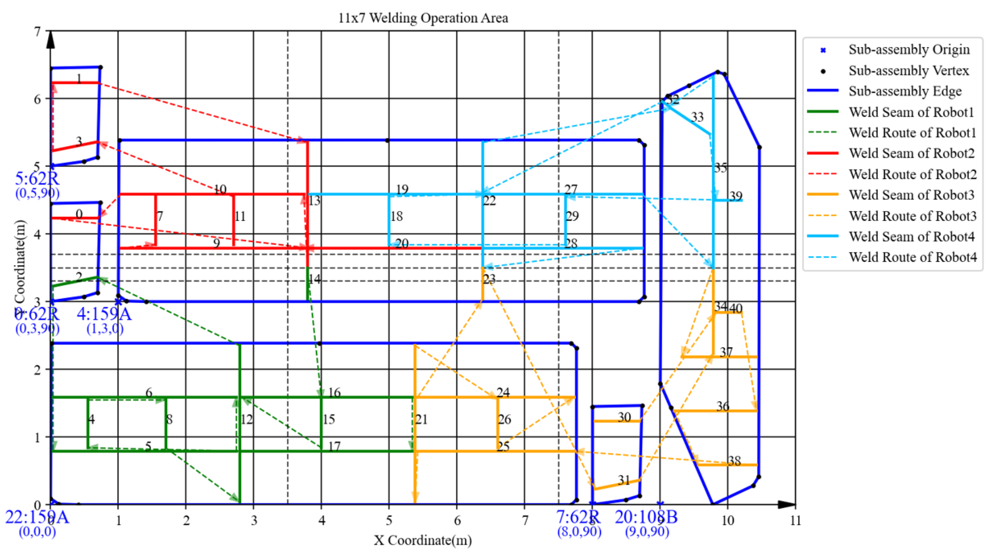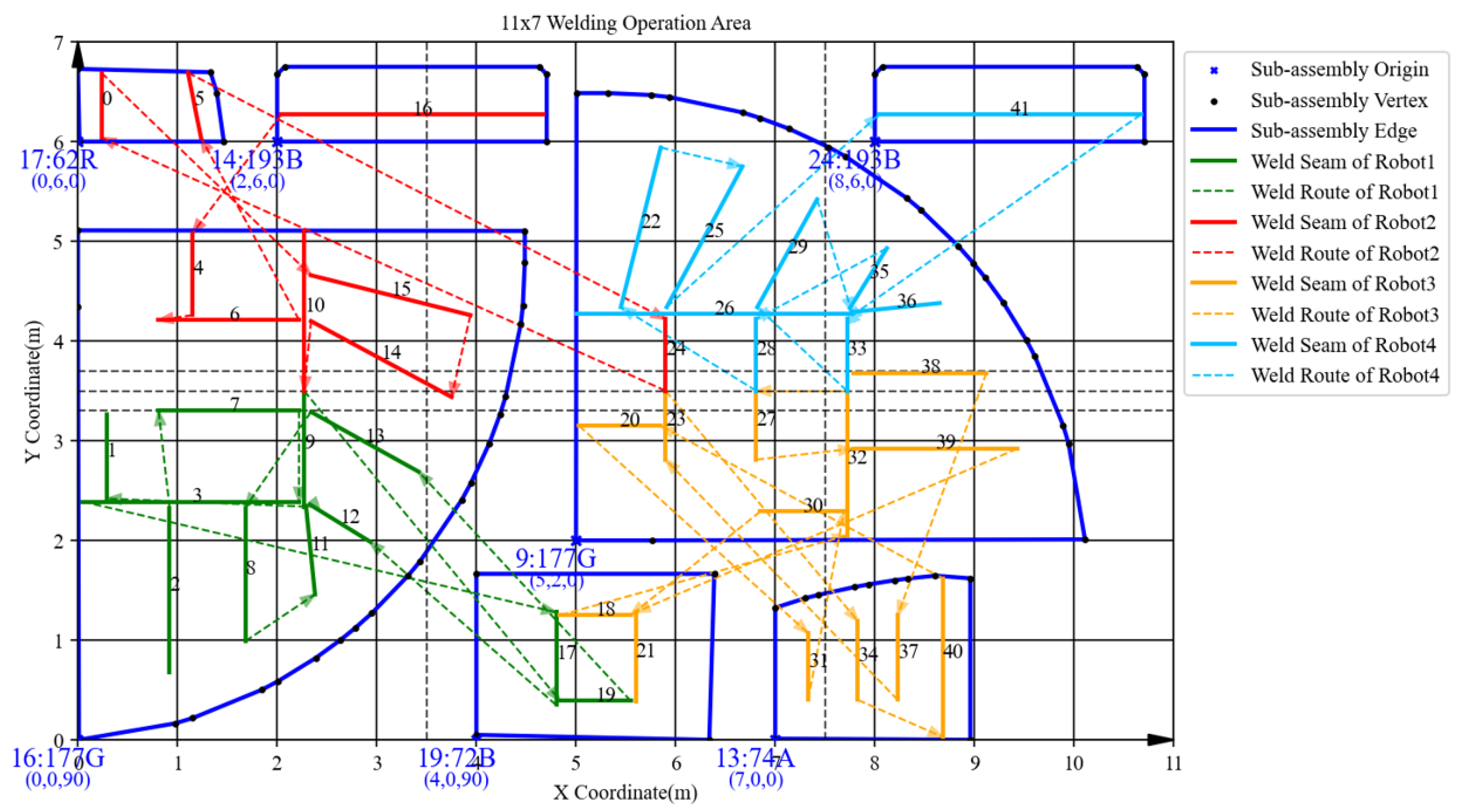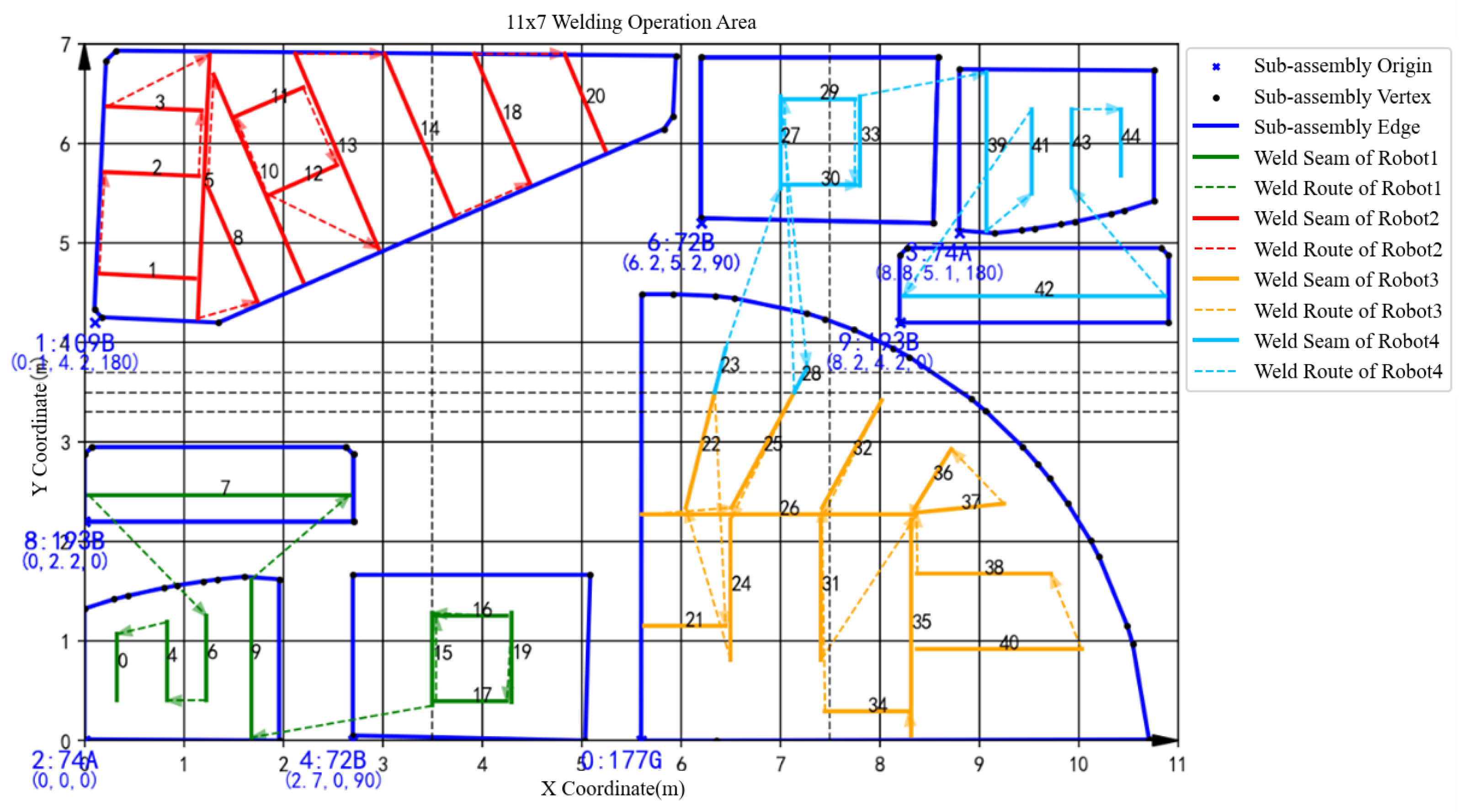 This paper uses partial data from a shipyard to form a solution case. The baseline case includes 30 sub-assemblies , the space size is . The safety distance between welding robots on the same side is 3.5 , the safety distance between welding robots on opposite sides is 3 , and the additional working distance in the Y-direction for welding robots at the junction of the upper and lower rollers is 0.2 .