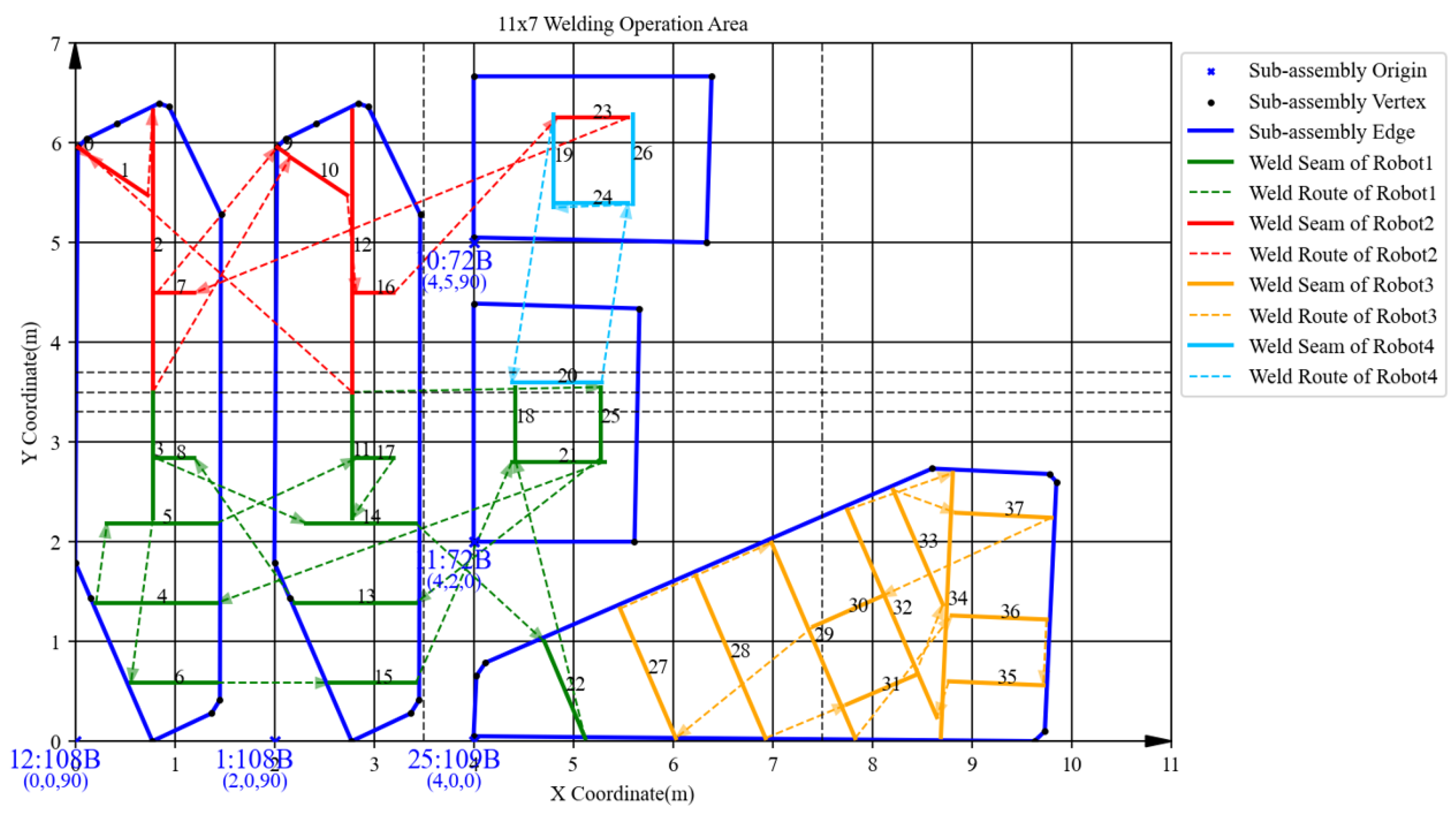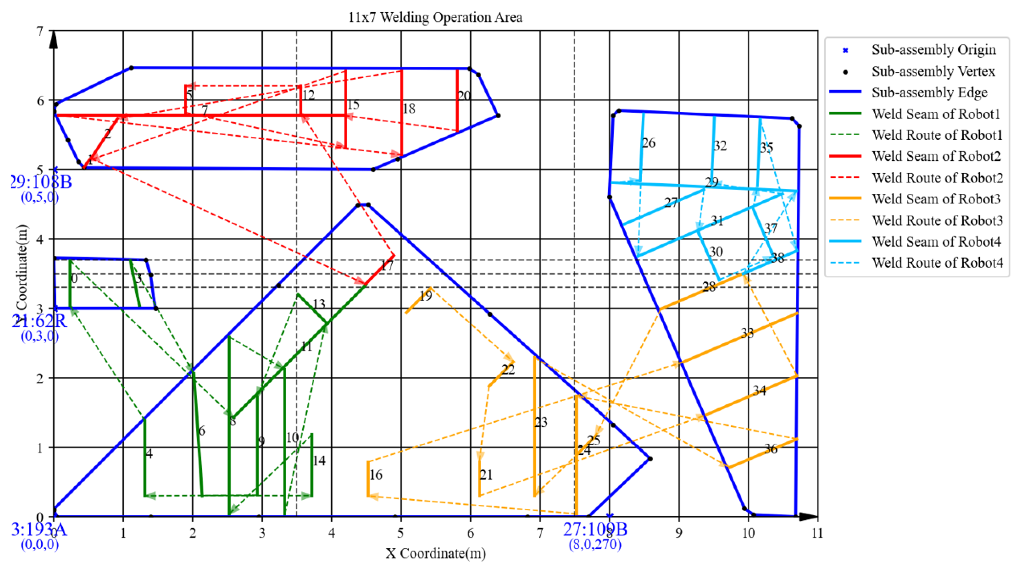 Figure 23), sub-assembly 108B is placed longitudinally, enabling the uniform distribution of its welding load between the upper and lower halves of the welding area. Consequently, the workloads of the upper and lower robots are more balanced, leading to nearly identical processing times among the four robots during subsequent weld scheduling. In contrast, in spatial layout of batch 2 of the manual scheduling results (