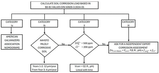 By contrast, for metallic structures that are fully or partially buried—such as the driven steel piles used in photovoltaic support structures—the available regulatory guidance and validated technical documentation remain limited. This scarcity is largely attributable to the wide range of interacting parameters governing soil corrosion and to the inherent difficulty of observing and monitoring buried systems. Existing standards, including DIN 50929-3:2024-05 [12], DVGW GW 9:2011 [13], AWWA C105/A21.5-18 [14] and UNE-EN 12501-1:2003 [15], primarily focus on classifying soil corrosivity based on selected environmental factors. Nevertheless, they generally provide corrosion rate data only for uncoated carbon steels and do not offer methodologies to estimate the service life of structures protected by hot-dip galvanized coatings or by more recent ZnAlMg alloy coatings.