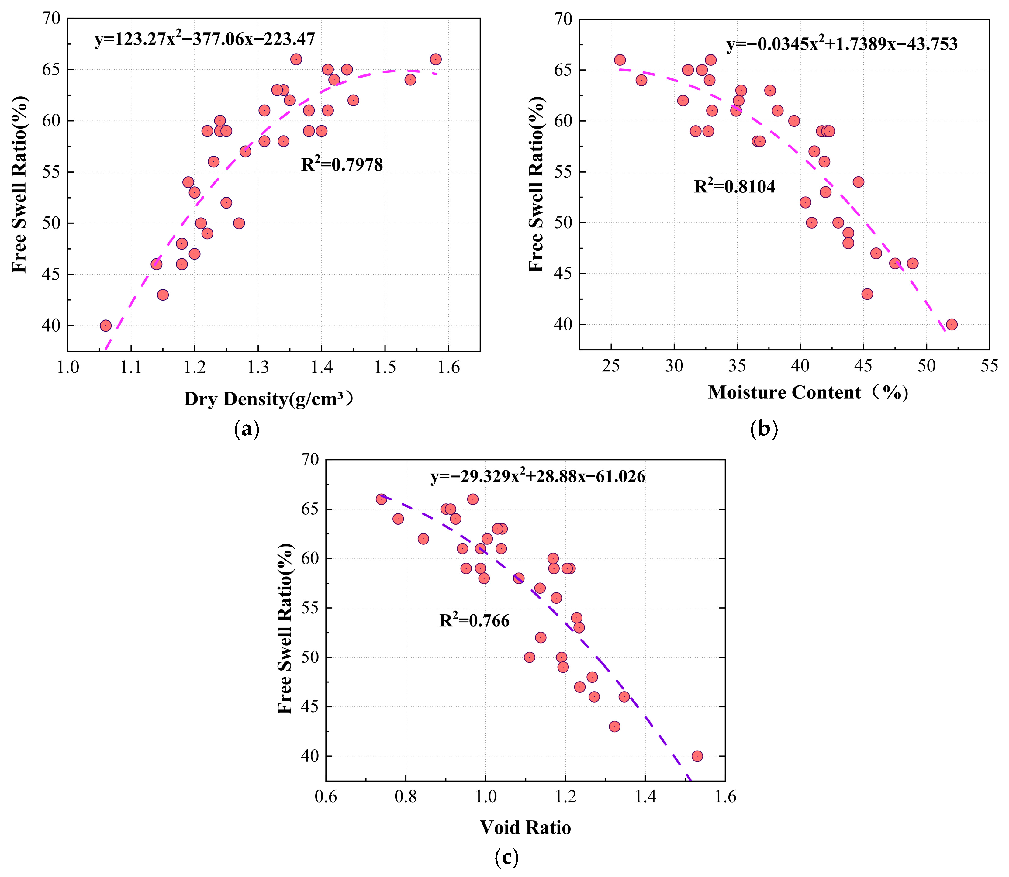 - The swelling characteristic parameters exhibited strong correlations with dry density, water content, and void ratio, all with correlation coefficients above 0.7. The governing equation for swelling pressure was pe = 70.47 − 0.469ω + 0.143ρ − 0.180e + 0.120δef and that for the free swell ratio was δef = 70.41 − 0.425ω + 0.18ρ − 0.209e. This indicates that water content is the most critical factor influencing swelling behavior.