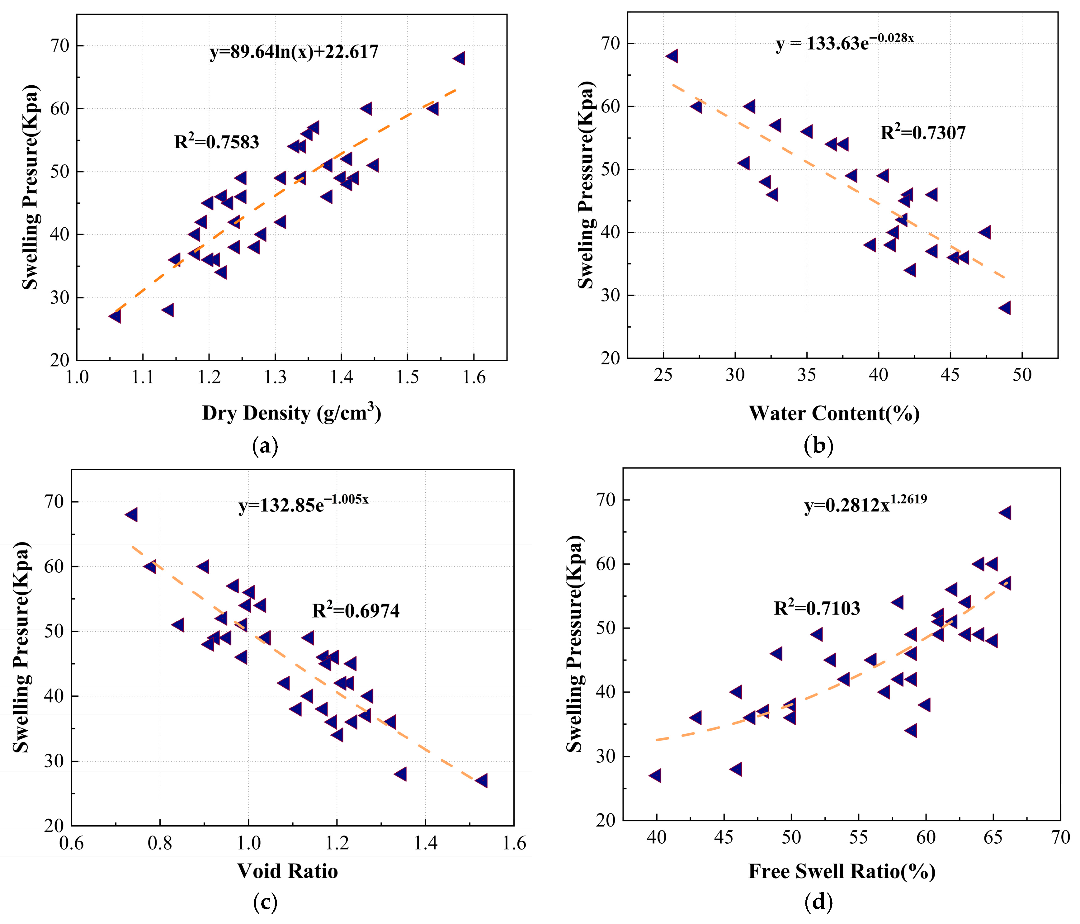 3.3. Swelling Pressure and Single-Factor Analysis of Physical Property Indices