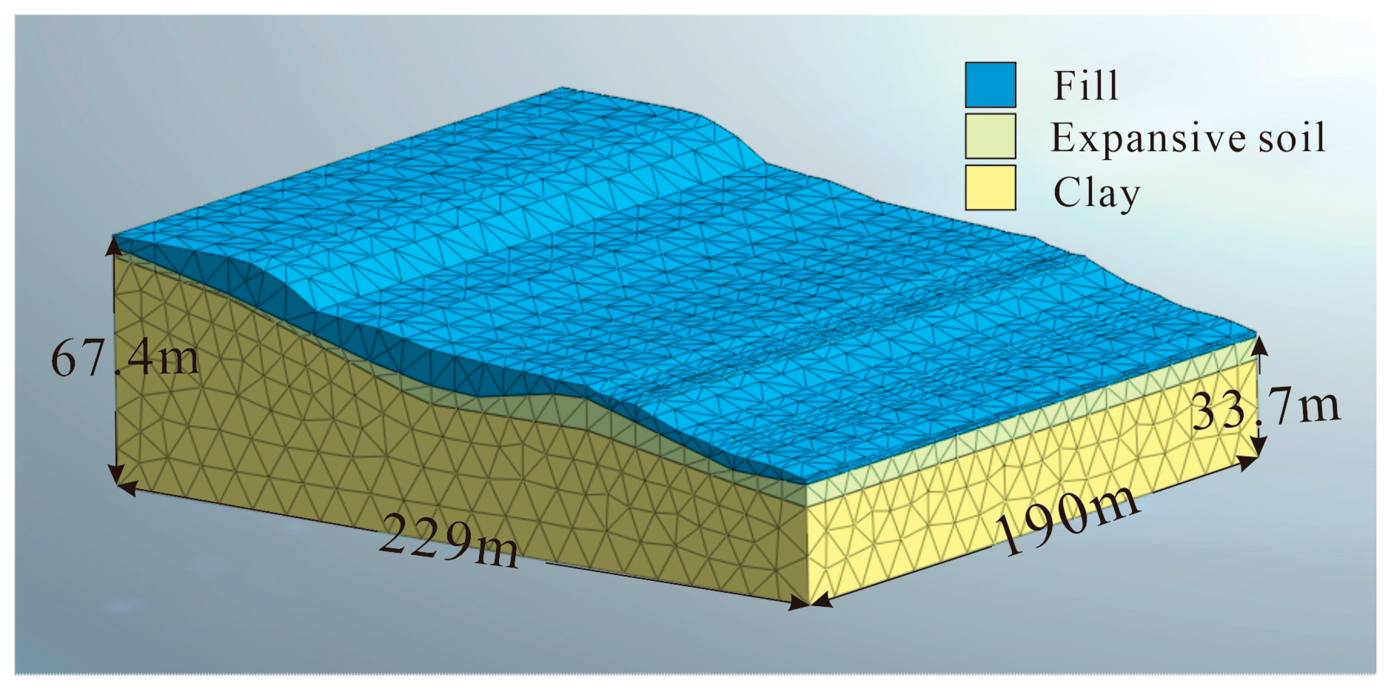 - Wang, A.; Xu, Y.; Xu, Y. Numerical modeling on the deformation features of expansive soil slopes under moisture variations based on fractal model. Comput. Geotech. 2024, 165, 105900. [Google Scholar] [CrossRef]