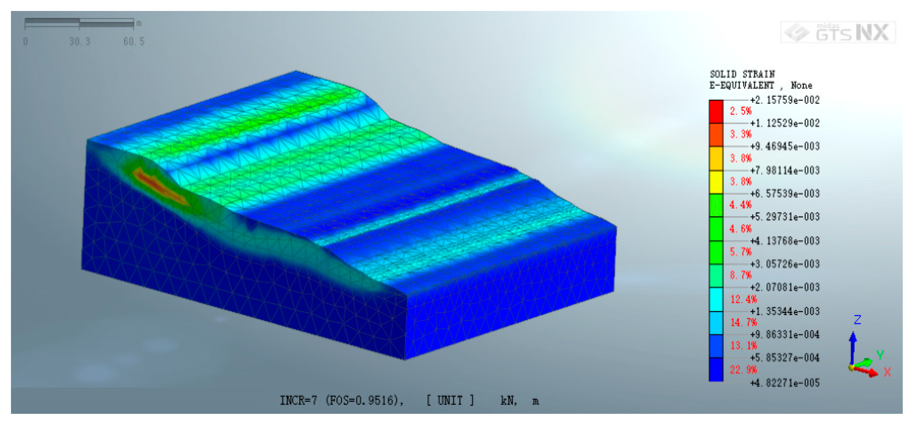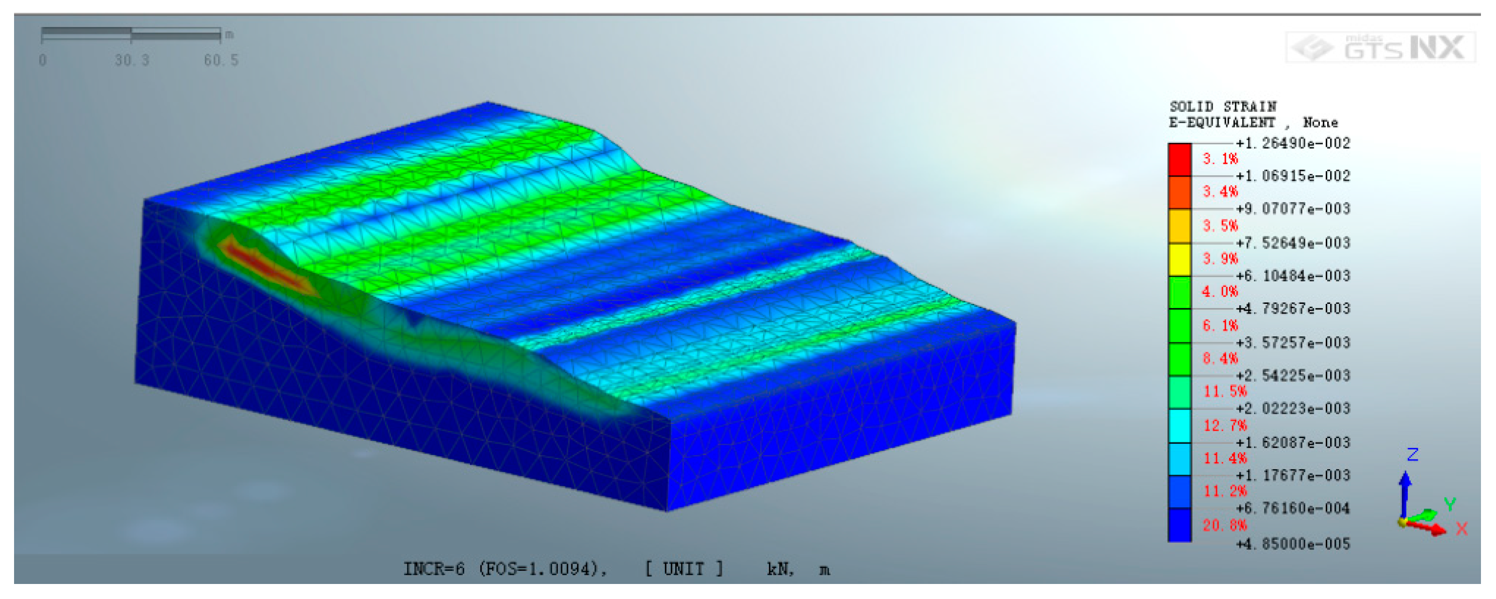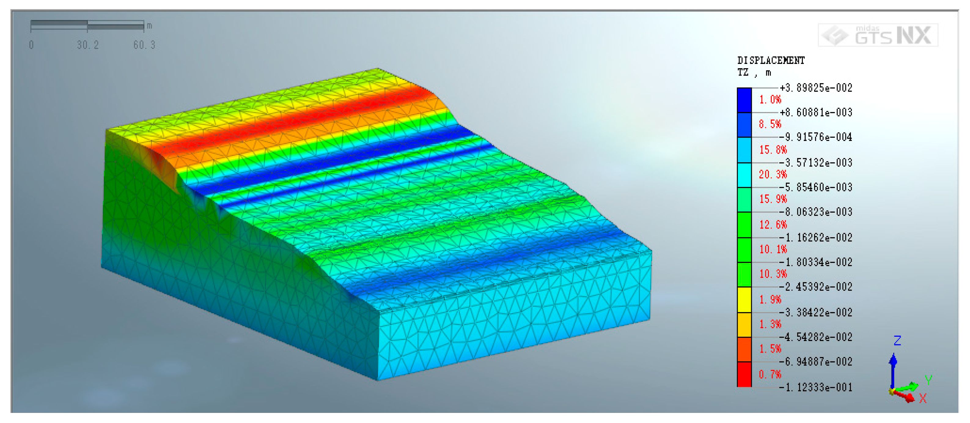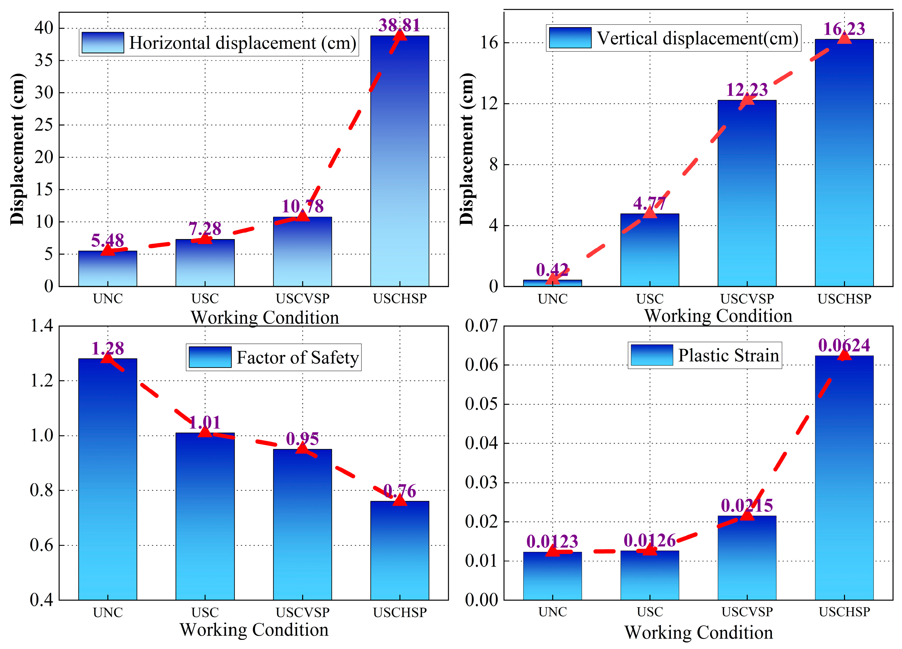- Under the saturated conditions of this case study, vertical swelling pressure increased x-displacement and z-settlement by 1.11 and 1.77 times, respectively, relative to the scenario without swelling pressures, while plastic strain and the factor of safety remained largely unchanged, indicating that vertical swelling primarily influences settlement. By contrast, horizontal swelling pressure increased x-displacement and z-settlement by 4.30 and 13.41 times, respectively, shifted the deformation zone forward, reduced the factor of safety by 24.75%, and promoted a more continuous slip surface, substantially enhancing the likelihood of slope failure.