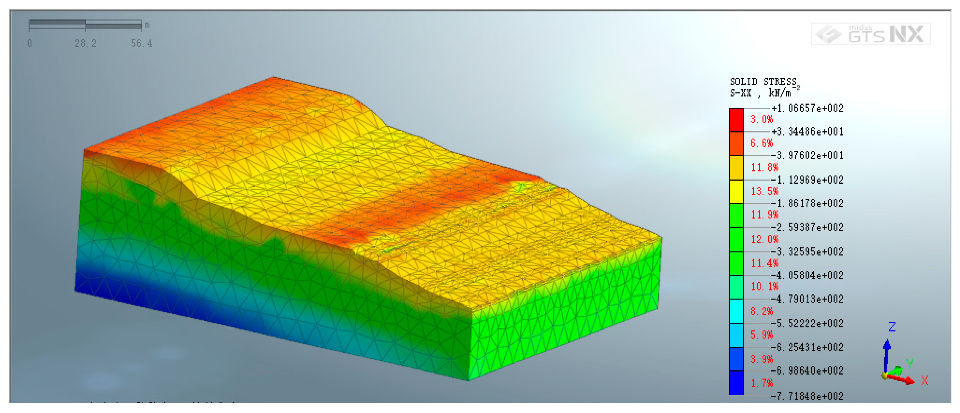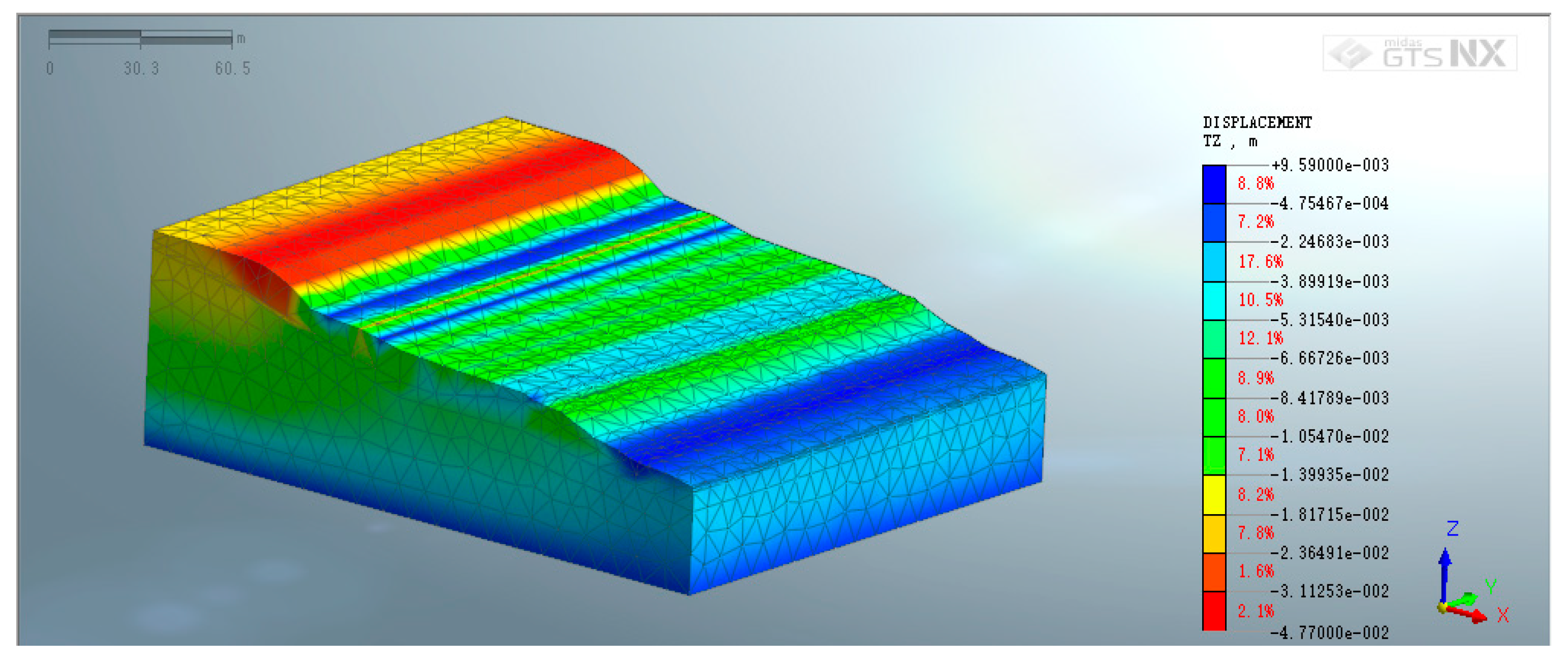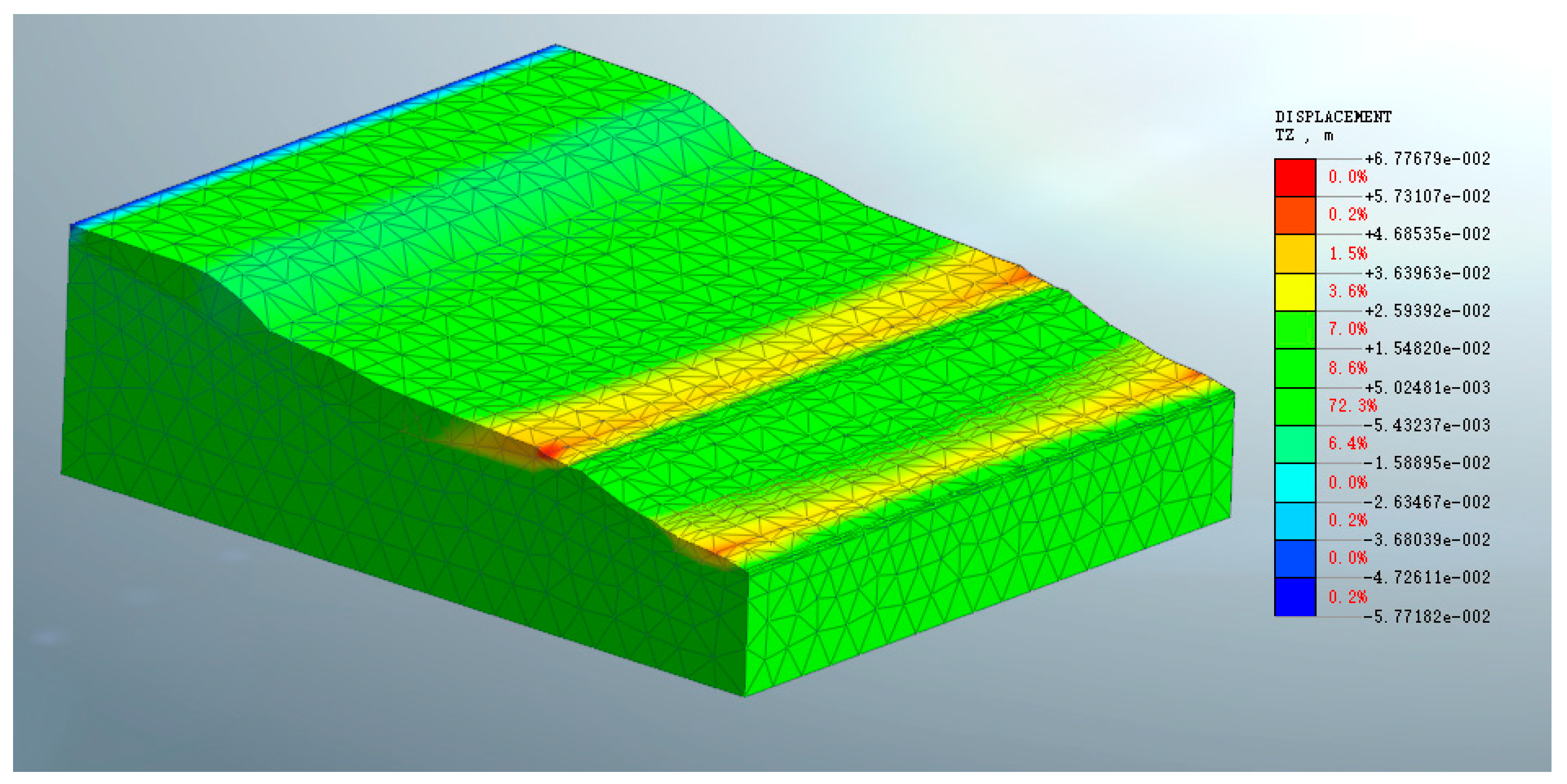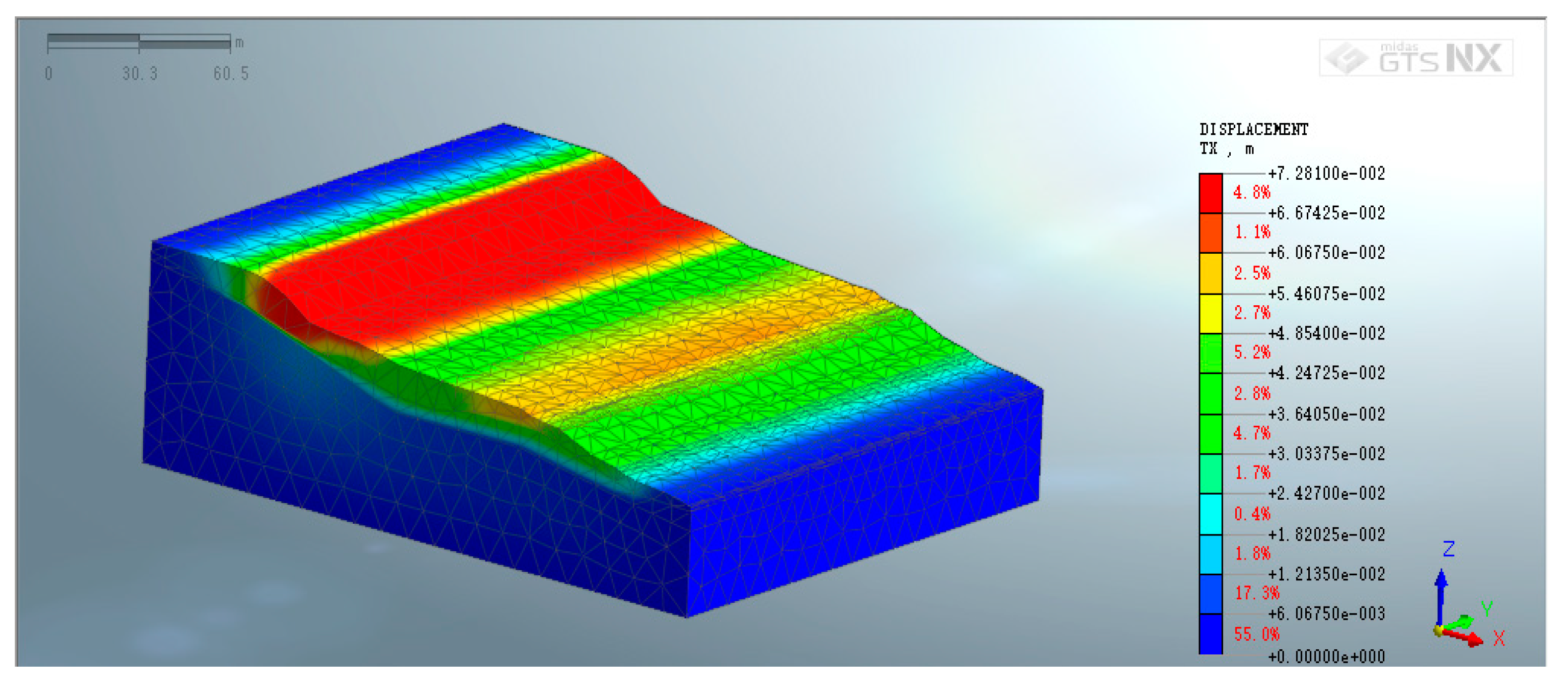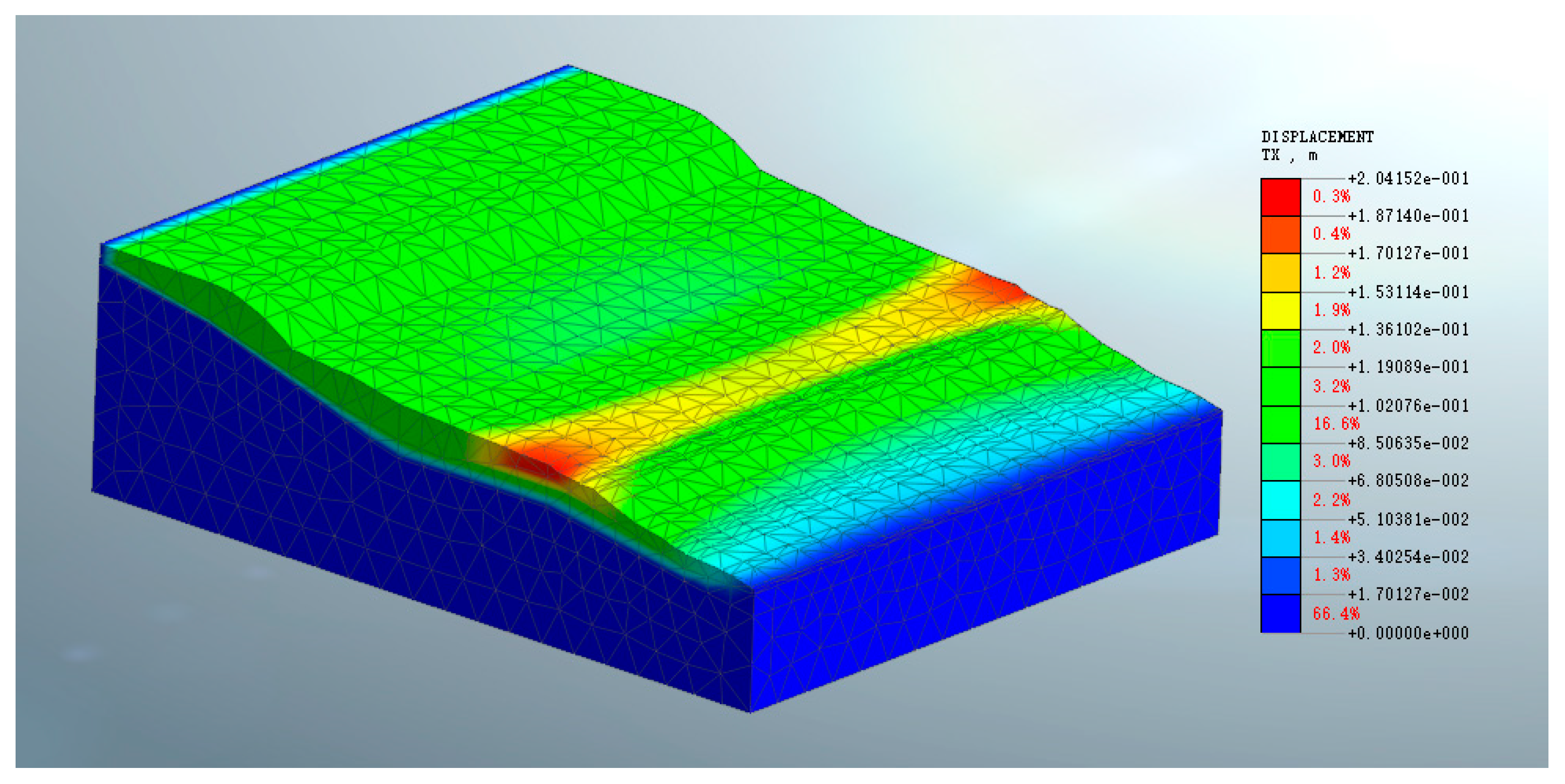 - Under the saturated conditions of this case study, vertical swelling pressure increased x-displacement and z-settlement by 1.11 and 1.77 times, respectively, relative to the scenario without swelling pressures, while plastic strain and the factor of safety remained largely unchanged, indicating that vertical swelling primarily influences settlement. By contrast, horizontal swelling pressure increased x-displacement and z-settlement by 4.30 and 13.41 times, respectively, shifted the deformation zone forward, reduced the factor of safety by 24.75%, and promoted a more continuous slip surface, substantially enhancing the likelihood of slope failure.