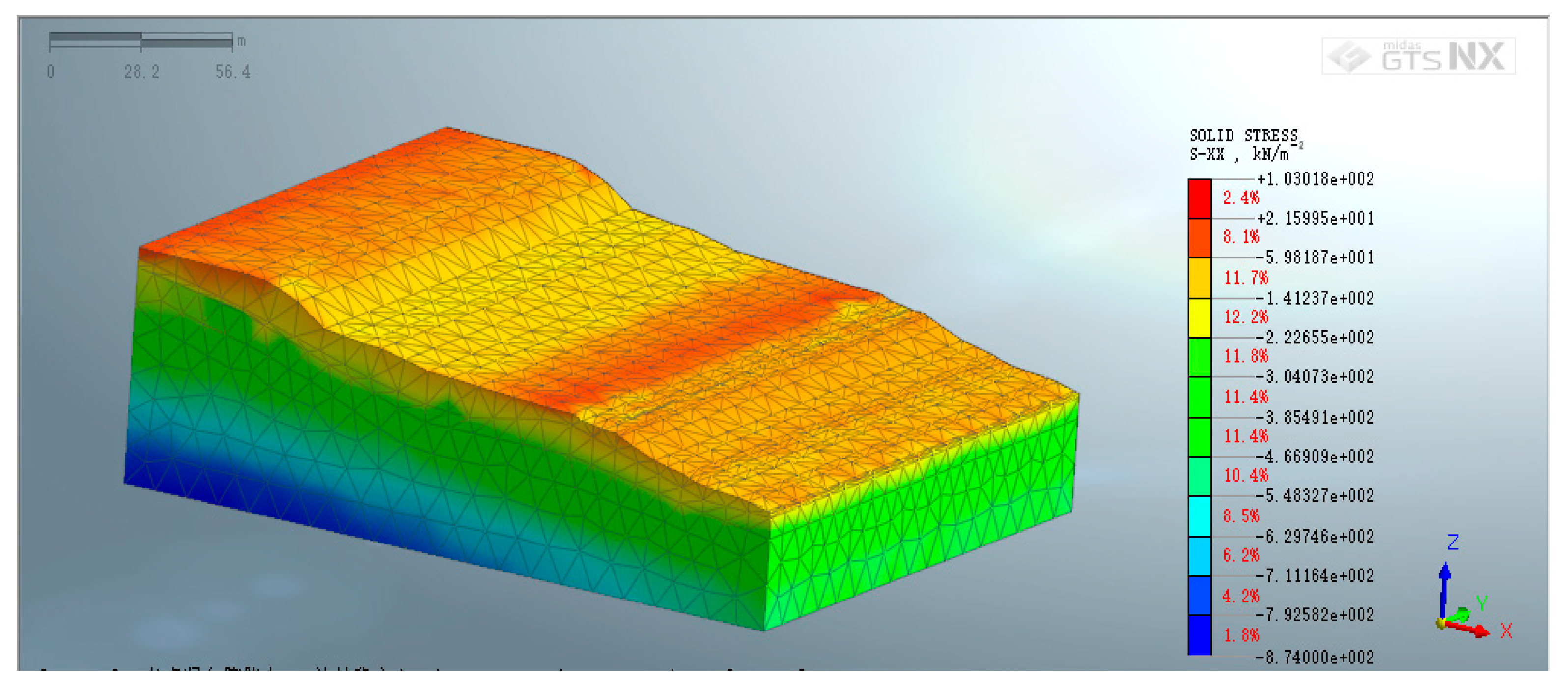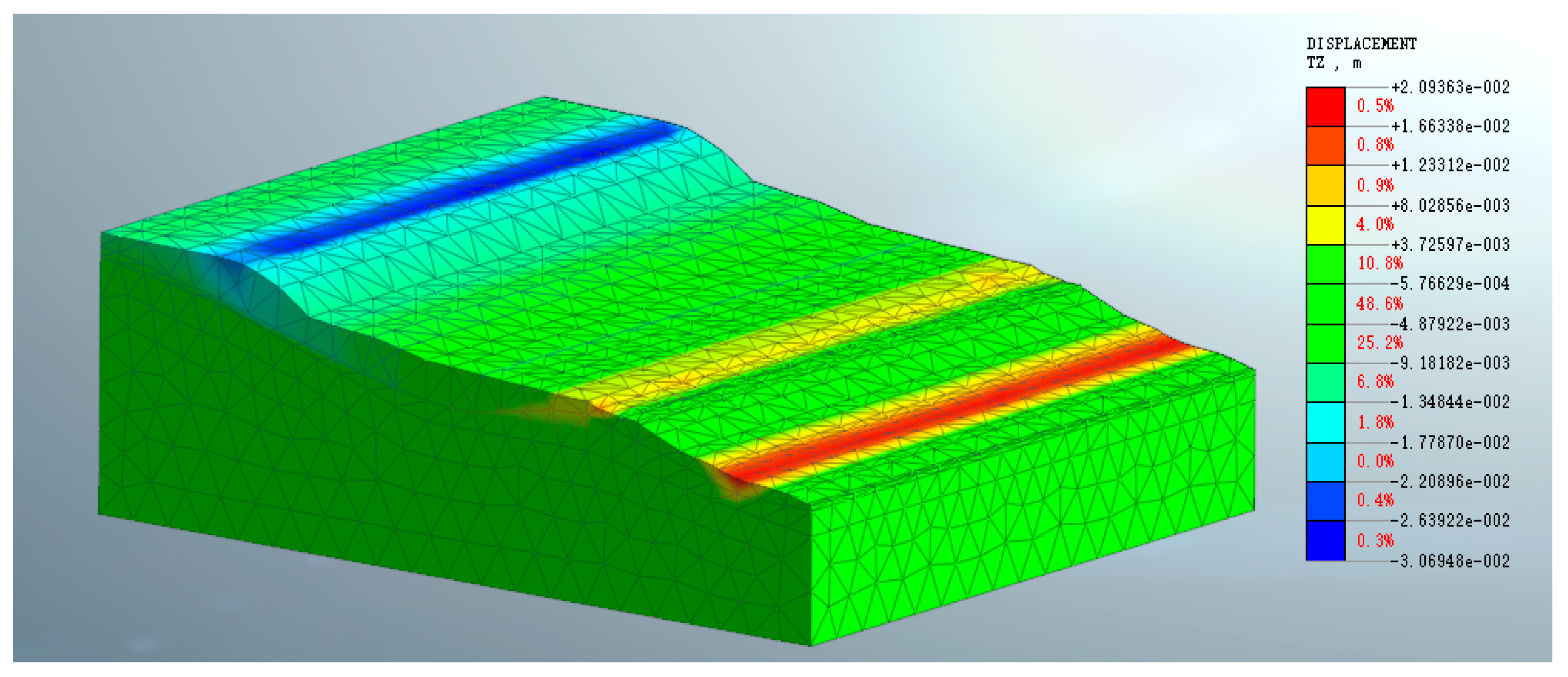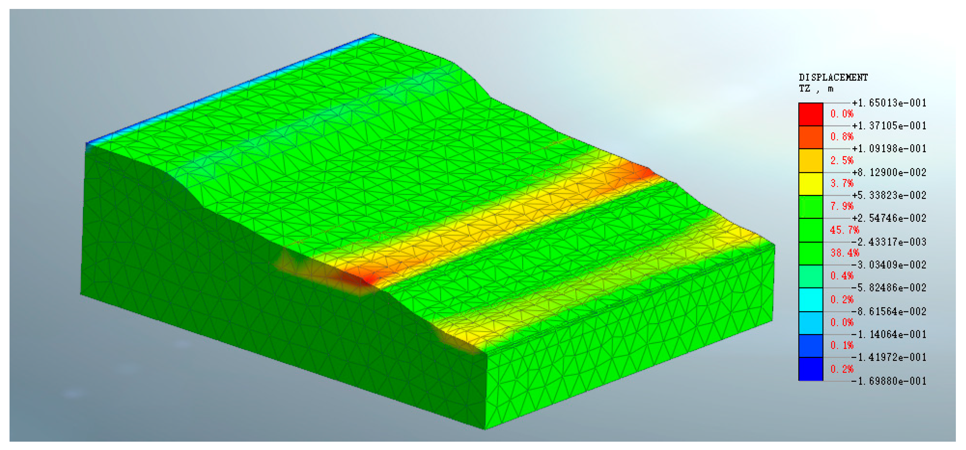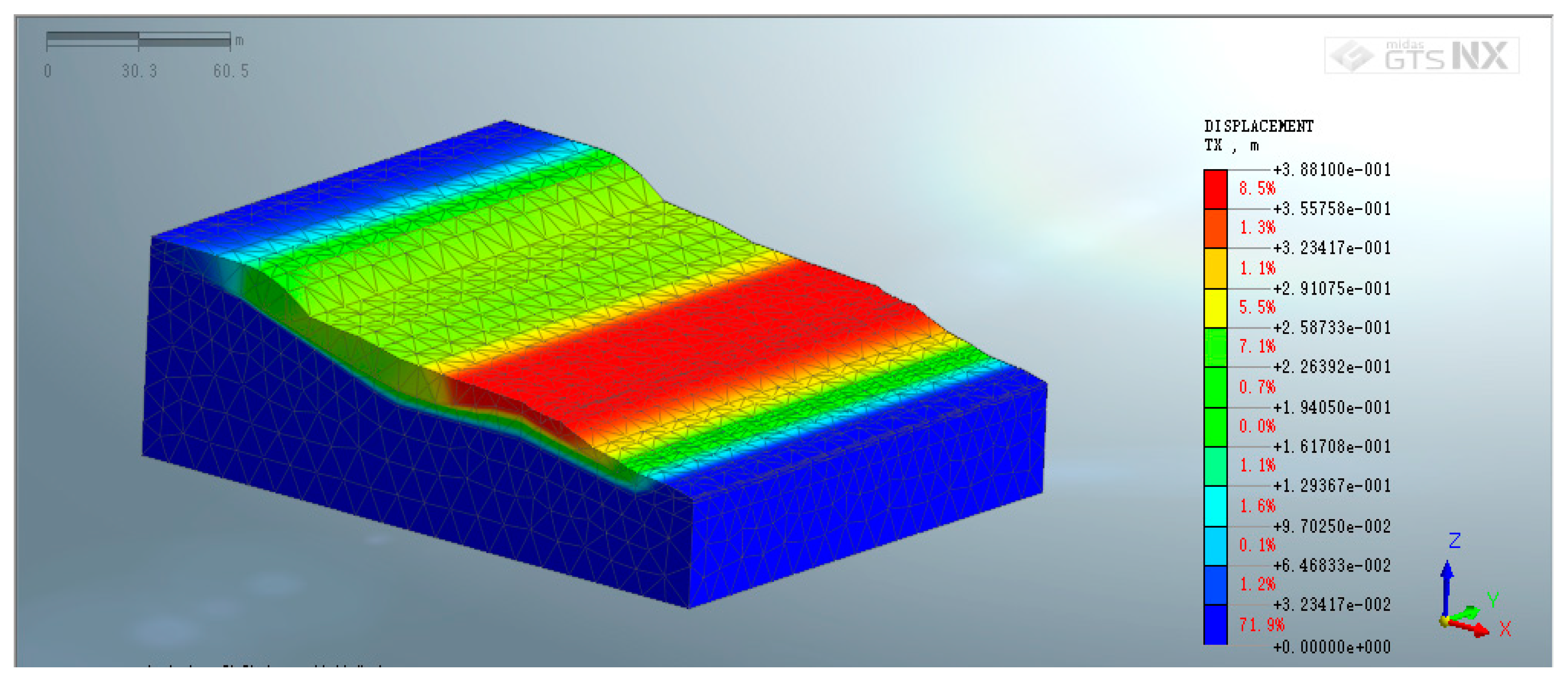 - Under the saturated conditions of this case study, vertical swelling pressure increased x-displacement and z-settlement by 1.11 and 1.77 times, respectively, relative to the scenario without swelling pressures, while plastic strain and the factor of safety remained largely unchanged, indicating that vertical swelling primarily influences settlement. By contrast, horizontal swelling pressure increased x-displacement and z-settlement by 4.30 and 13.41 times, respectively, shifted the deformation zone forward, reduced the factor of safety by 24.75%, and promoted a more continuous slip surface, substantially enhancing the likelihood of slope failure.