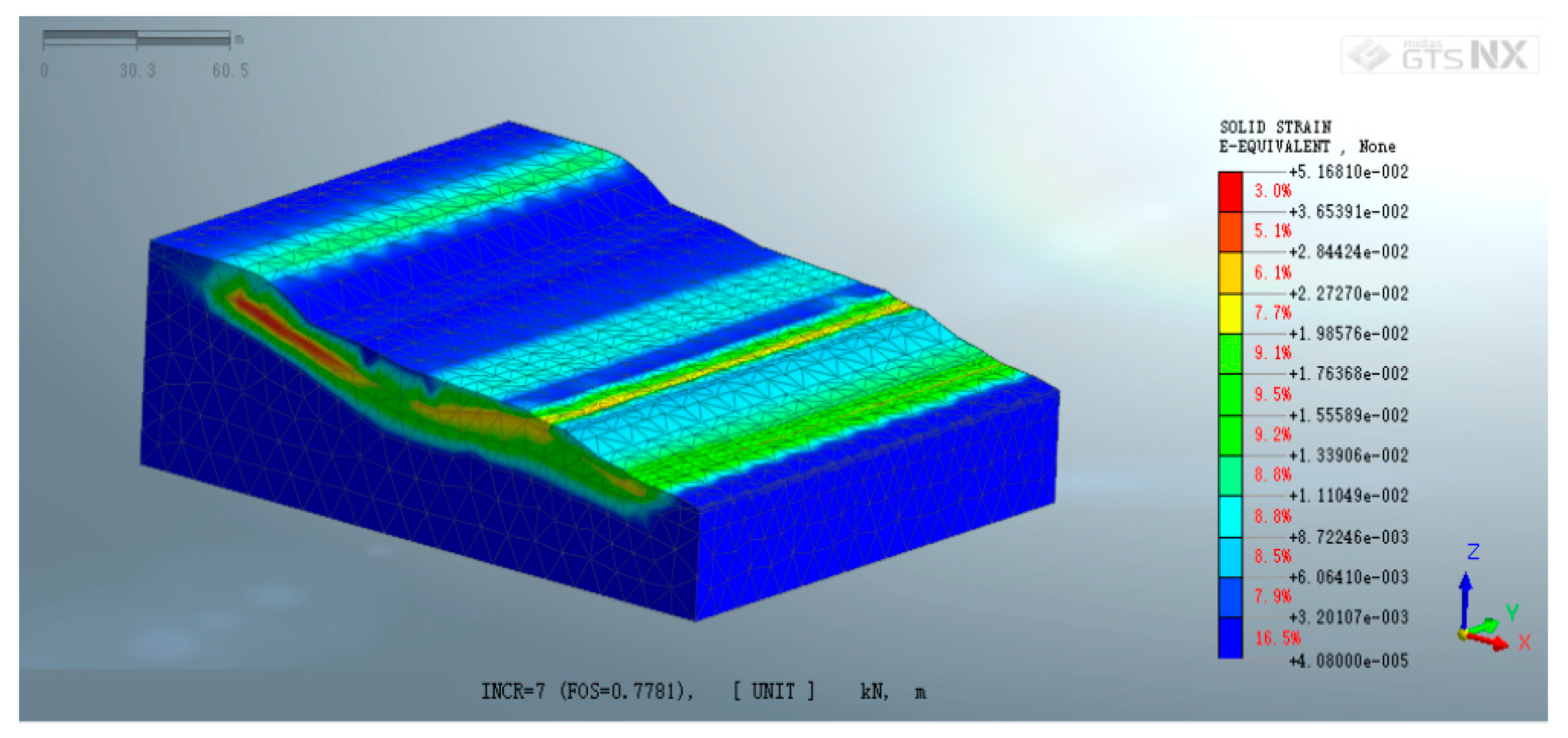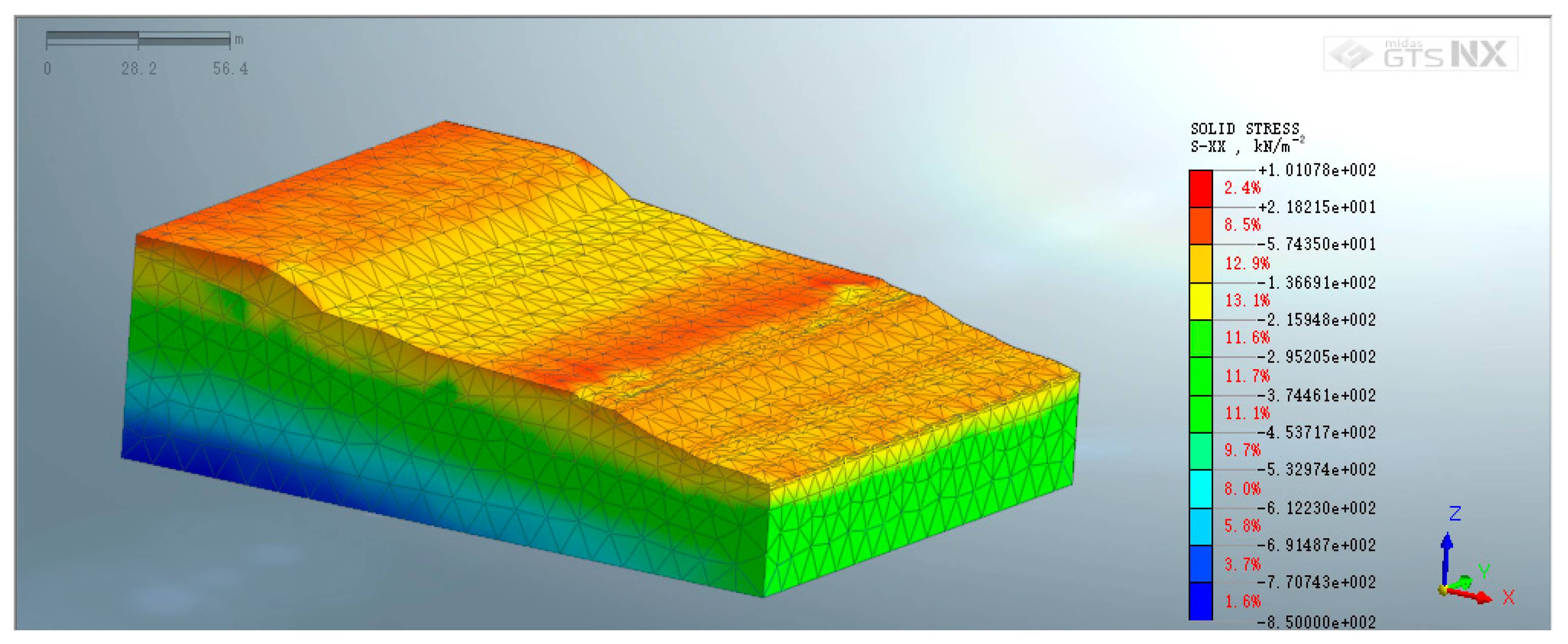 - Ye, Z.C.; Yang, Y.; Yang, J.X.; Zuo, X.H. Stability analysis of a slope in Wencheng County based on MIDAS GTS/NX. Ind. Saf. Environ. Prot. 2022, 48, 62–65, 99. [Google Scholar]