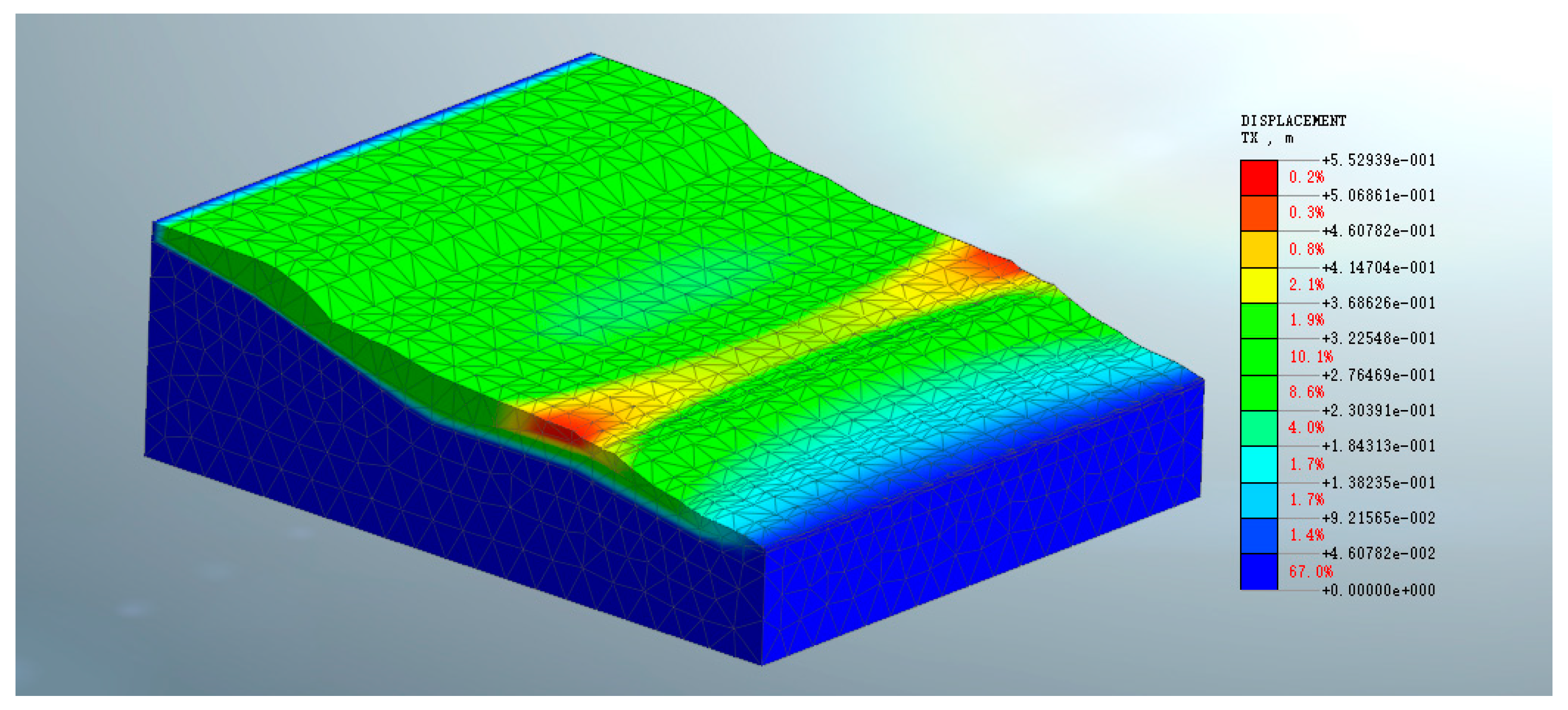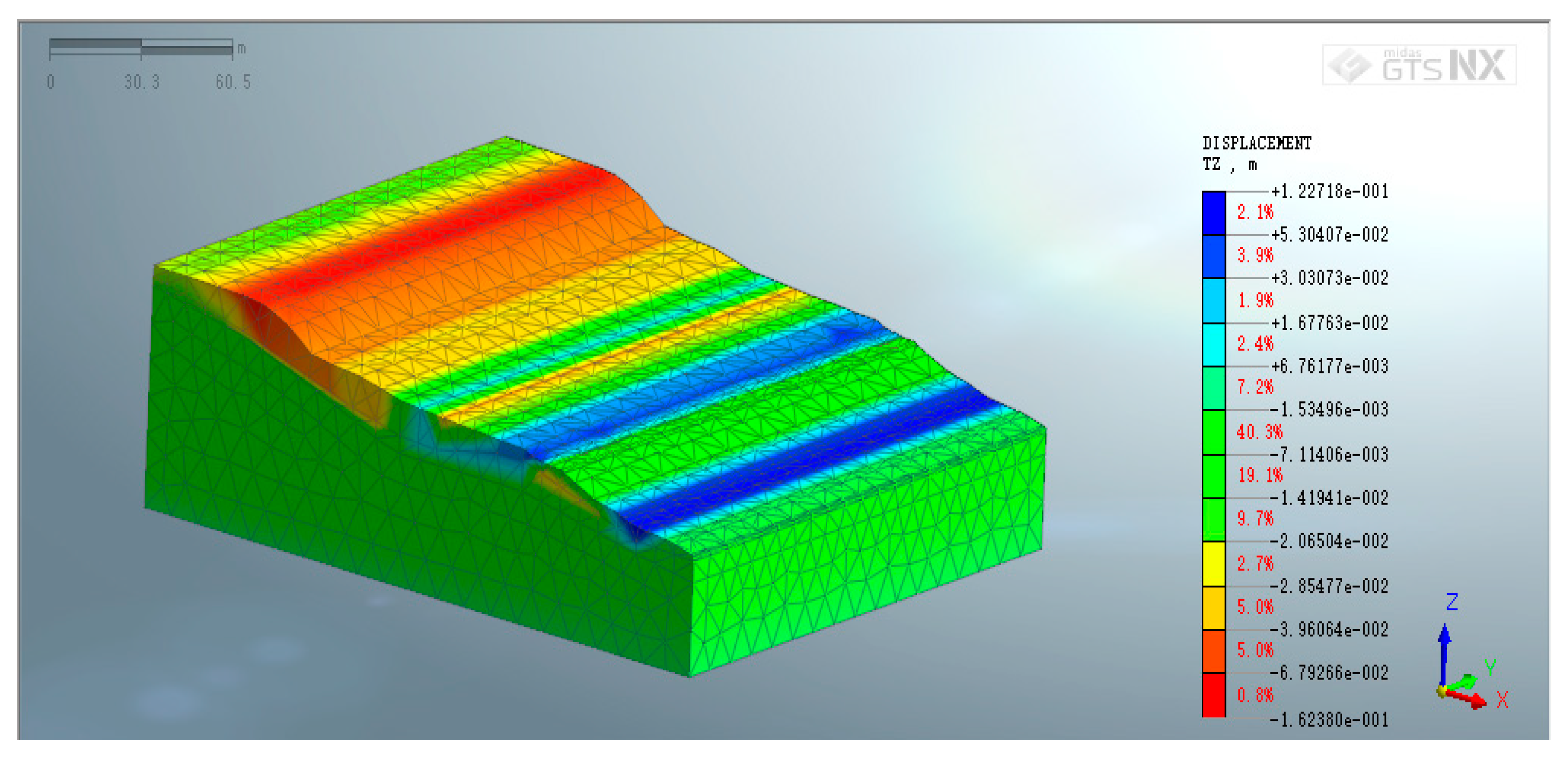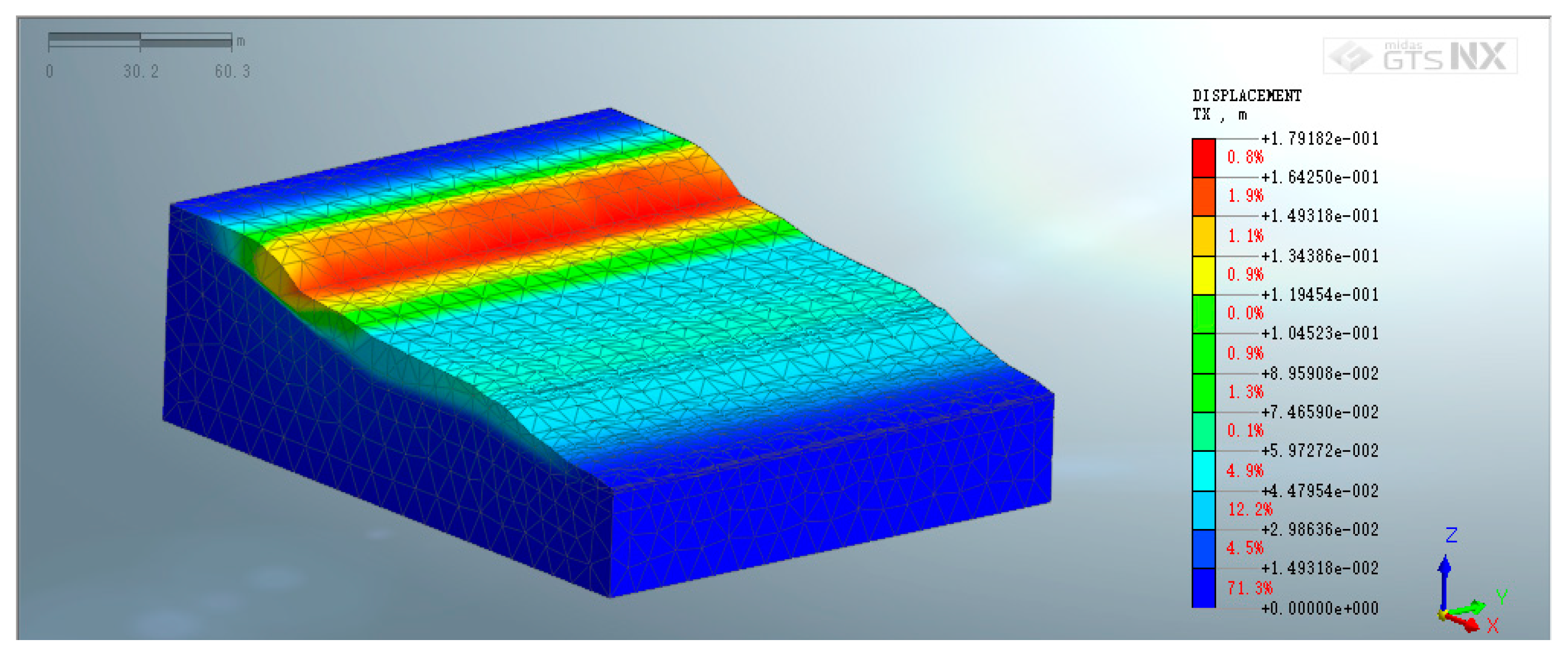 - Liu, Y.; Zhang, G.H.; Yang, J.H.; Dong, P.; Mao, J.C.; Gan, X.Y. Landslide stability analysis and feasibility study of remediation measures based on Midas GTS/NX. Sci. Technol. Innov. 2023, 133–136. [Google Scholar]