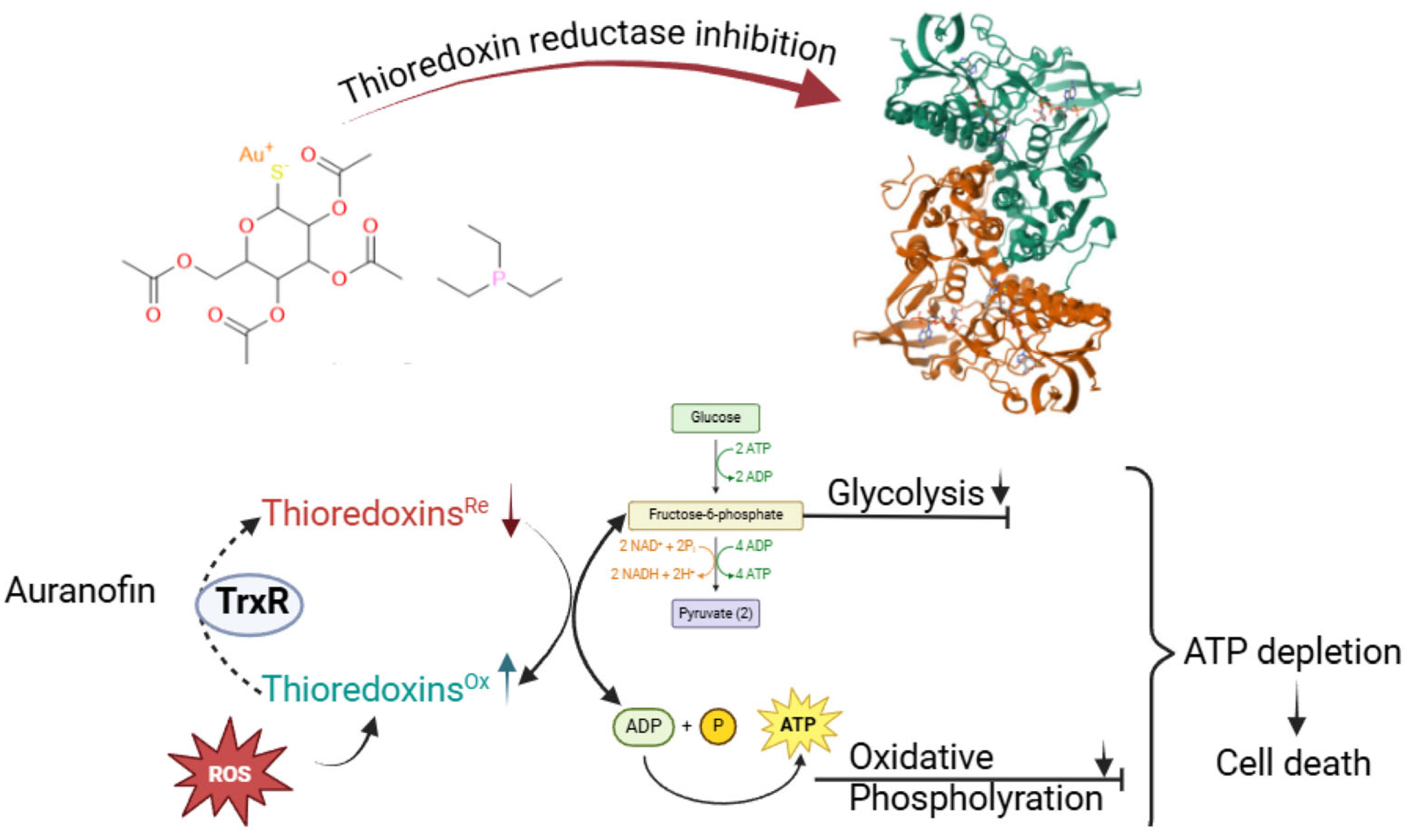 - Abdalbari, F.H.; Telleria, C.M. The gold complex auranofin: New perspectives for cancer therapy. Discov. Oncol. 2021, 12, 42. [Google Scholar] [CrossRef]