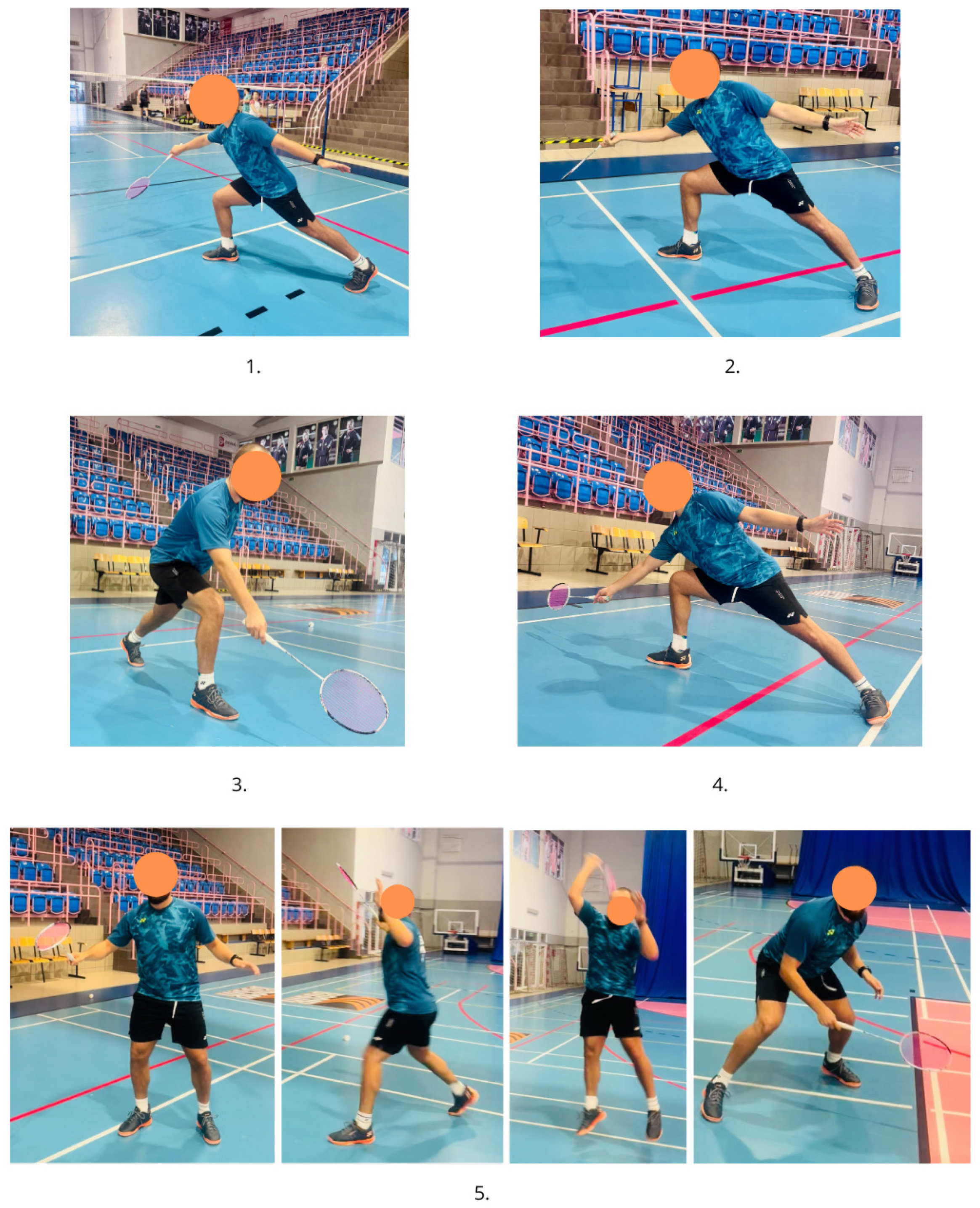 The movement begins with a take-off to the shuttle—a jump with the legs directed towards the forehand net (the right leg is the leg that determines the direction). The player takes off from the left leg by performing a lead-in step. The approach movement ends with a lunge onto the right leg. The player transfers weight to the dominant leg by bending the hip, straightening up and extending a straight arm towards the net. The shuttlecock is hit. When returning, the player takes off from the right leg and returns to the starting position by performing a double lead-in step.