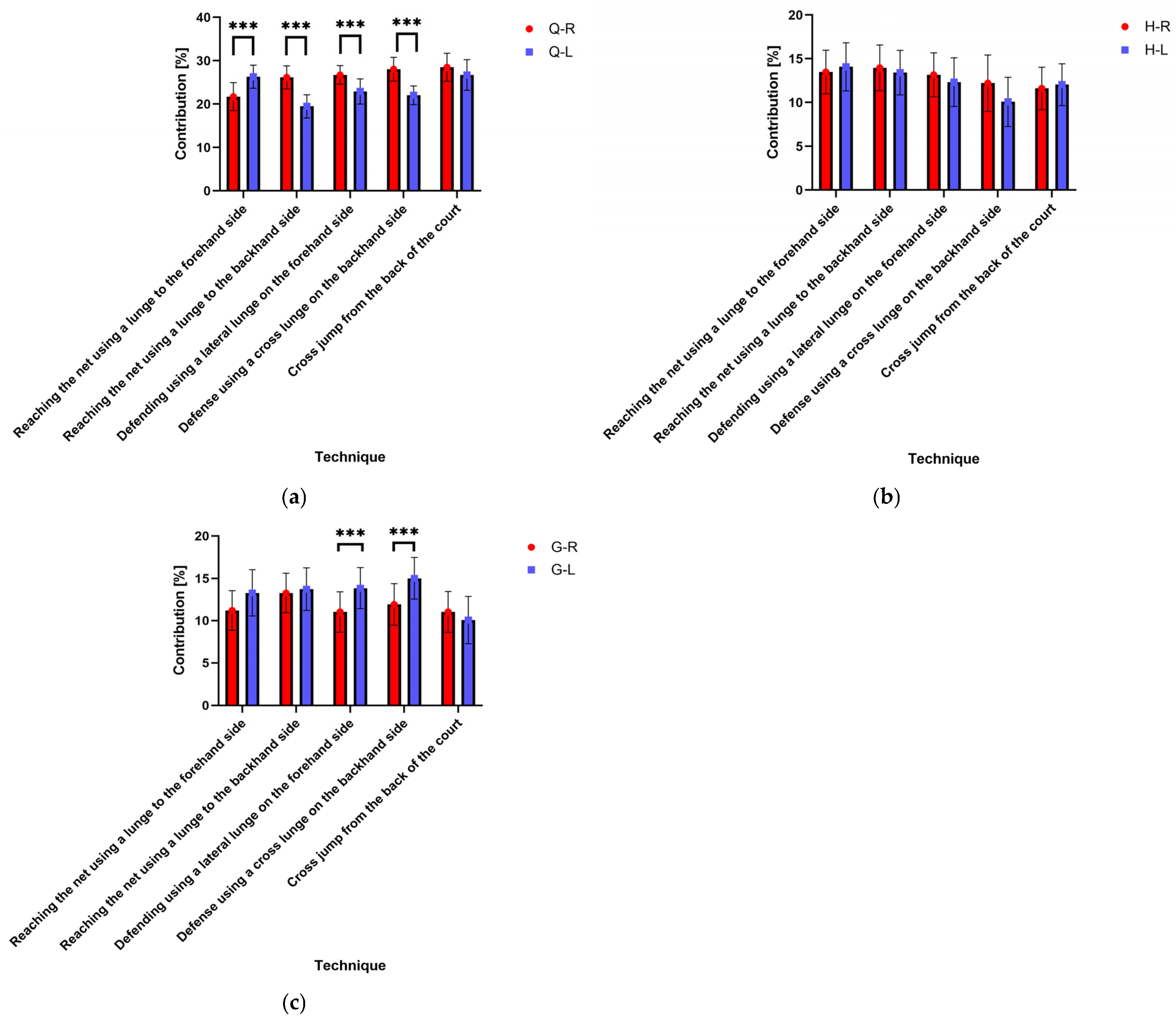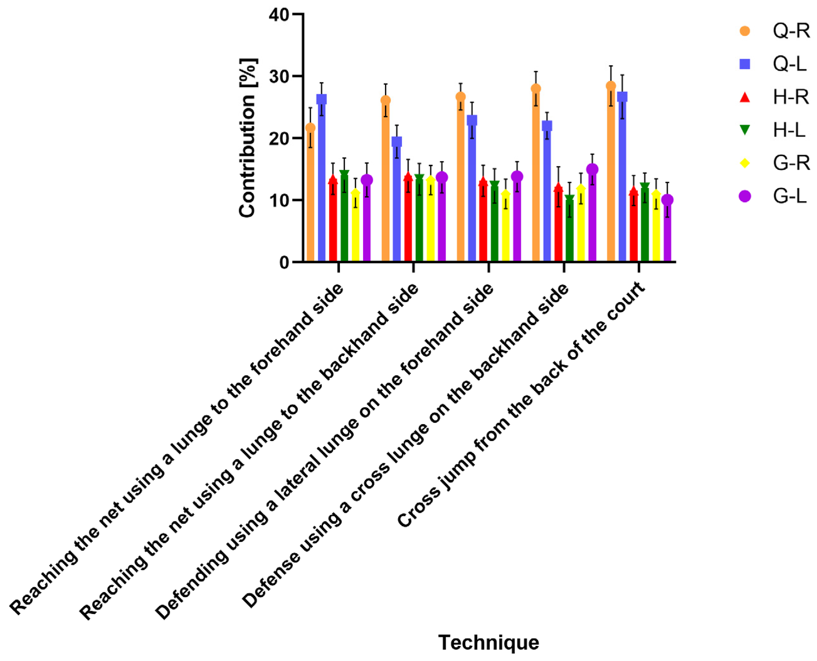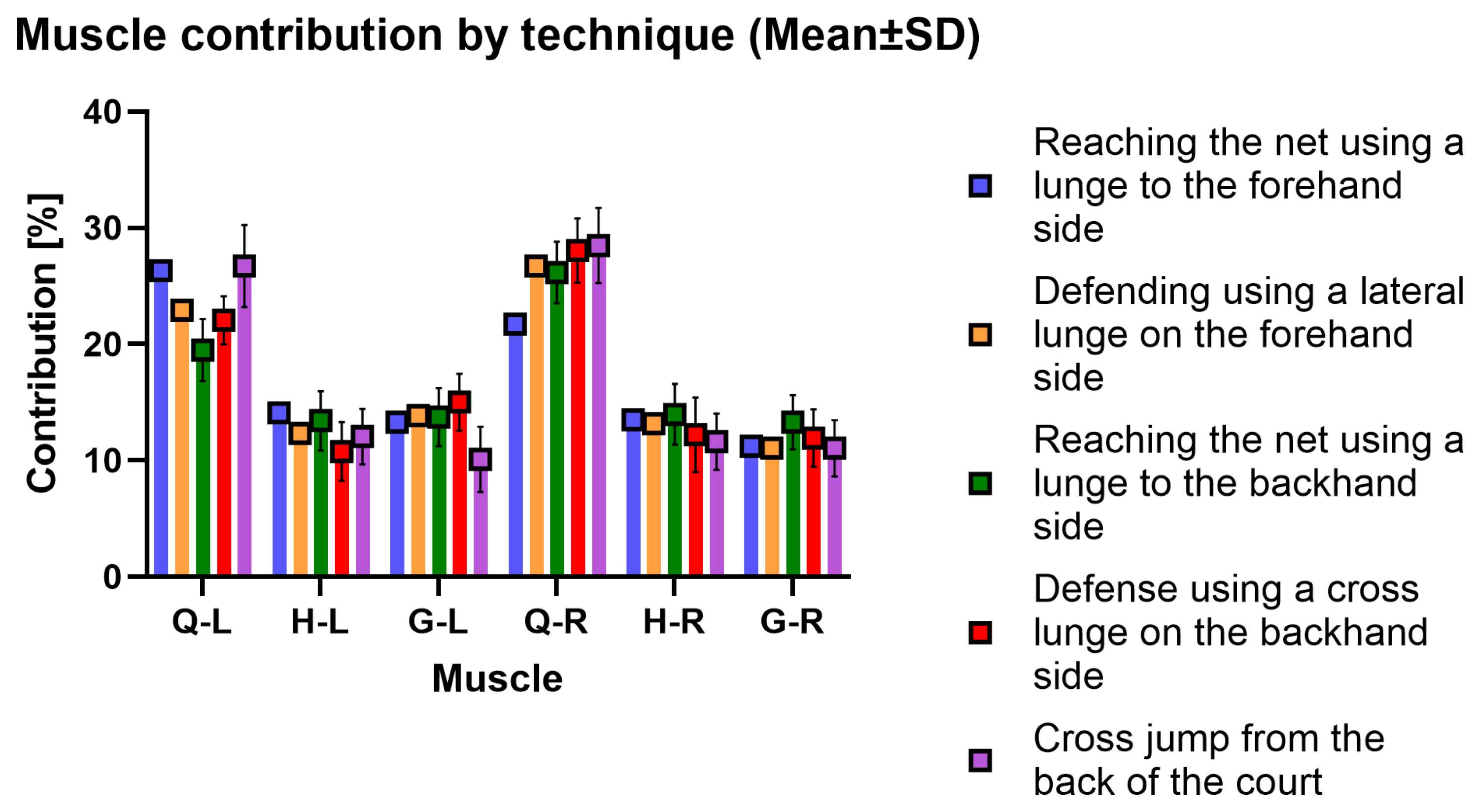 The primary objective of the EMG analysis was to examine the relative distribution of muscle activity across the main lower limb muscle groups during badminton-specific techniques, rather than quantifying peak or maximal activation levels. Accordingly, the EMG outcomes were expressed as the percentage contribution of each muscle group within a given task, where 100% represented the summed activity of the analysed muscle groups for each limb. This analytical framework places particular emphasis on neuromuscular coordination and task-specific recruitment strategies, rendering it especially suitable for highly repeatable and technically constrained movements performed by elite athletes.