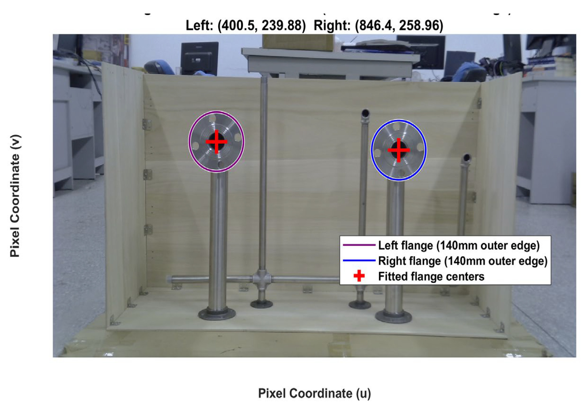 - A multi-constraint flange detection and fitting strategy is designed. Background interference is eliminated by combining the physical size constraints of flanges, the left and right flanges are distinguished using K-means clustering, and weighted fitting is adopted to enhance the core features of the outer edge circle, thereby improving the positioning stability.