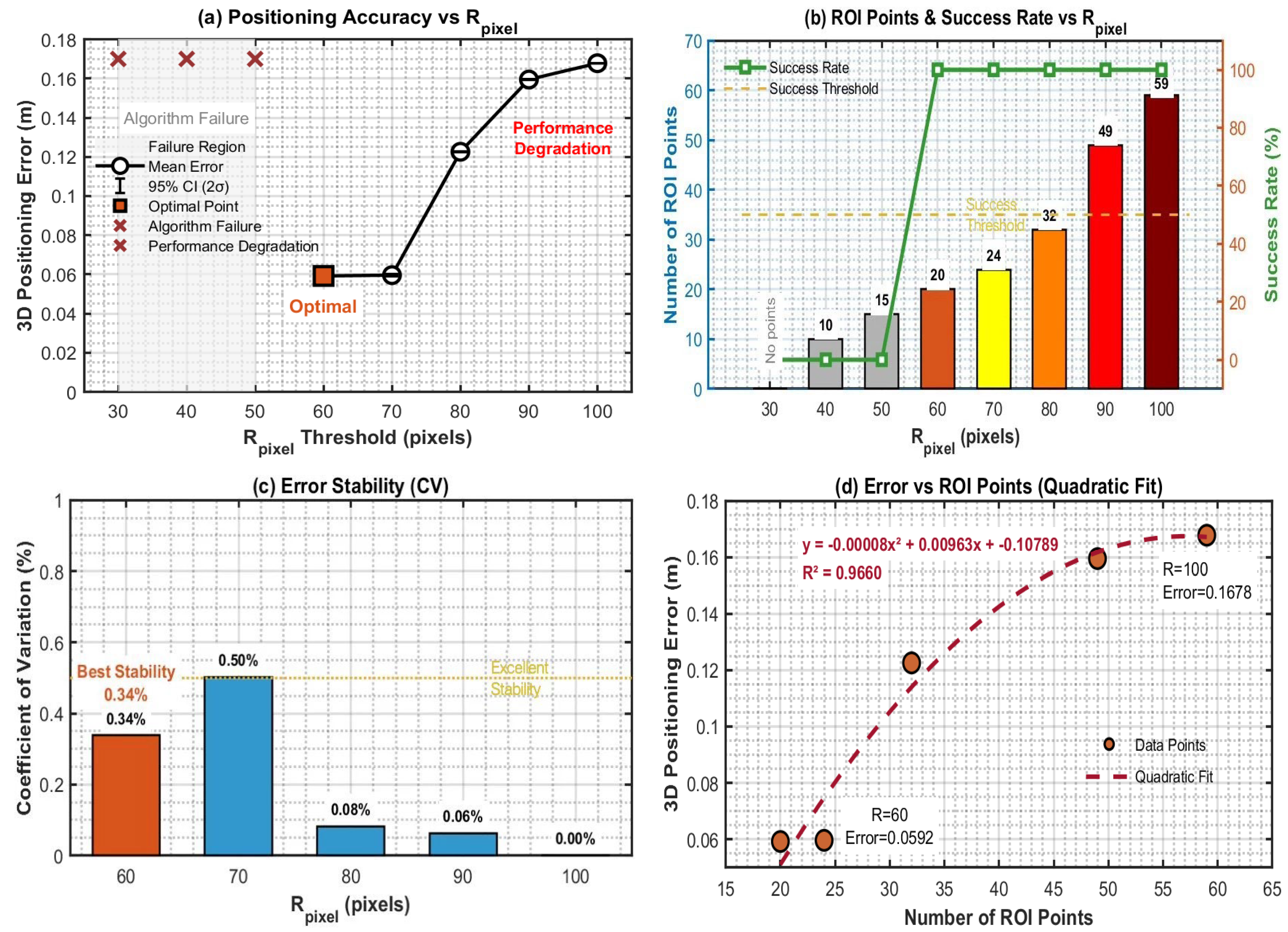 - Performance Defects of Rₚᵢₓₑₗ < 60: When Rₚᵢₓₑₗ = 30–40, the number of ROI points is ≤9.5, leading to complete failure of plane fitting due to insufficient valid points (success rate = 0%); when Rₚᵢₓₑₗ = 50, although the success rate reaches 100%, the number of ROI points is only 15, the positioning error (0.0604 m) is higher than that of Rₚᵢₓₑₗ = 60, and the error stability is poor (coefficient of variation = 0.50%), making it difficult to meet the fitting requirements under complex illumination.