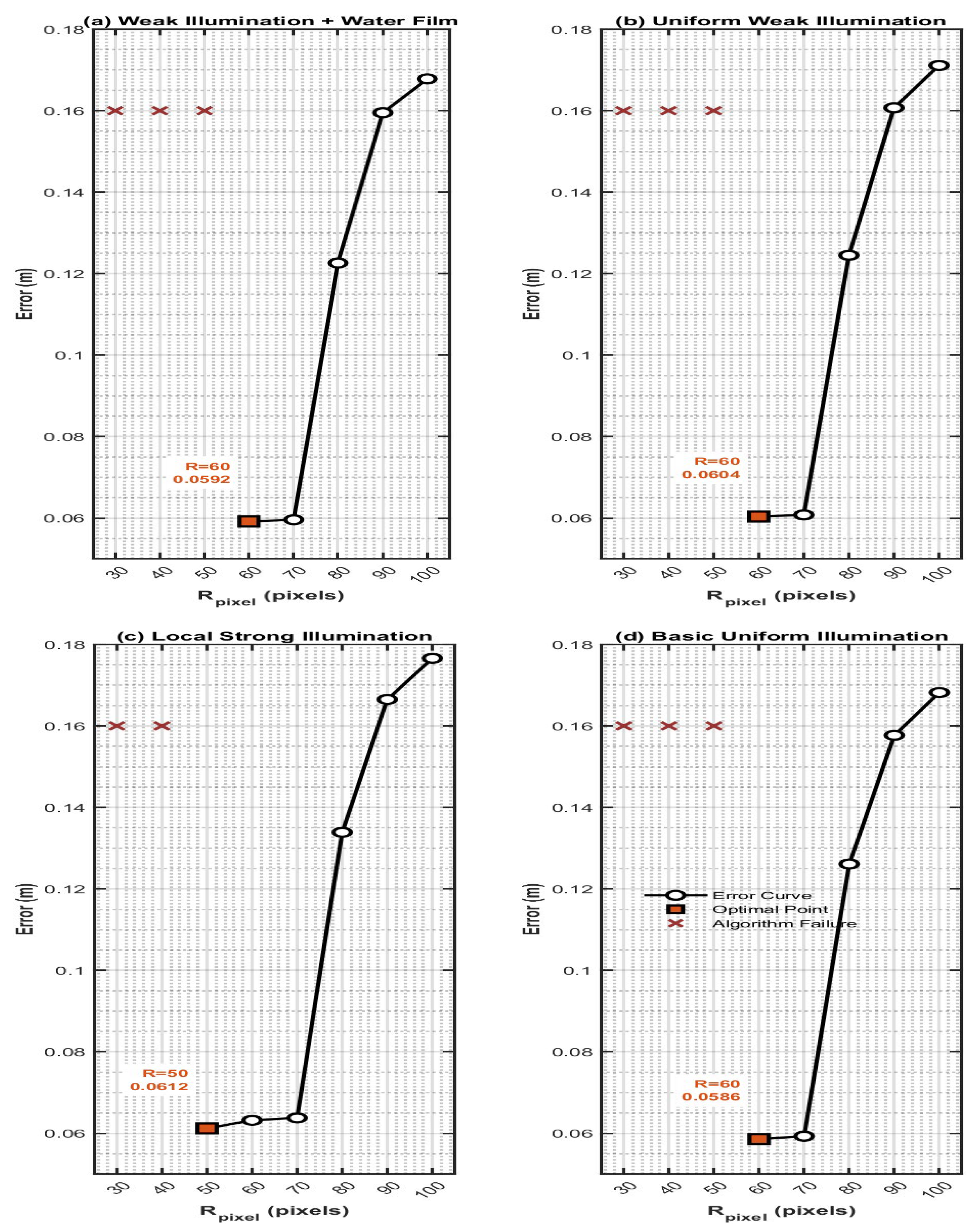 - Cross-Scenario Robustness: Rₚᵢₓₑₗ = 60 maintains optimal accuracy and stability in all illumination scenarios: the error is 0.0586 m under basic uniform illumination, 0.0632 m under local strong illumination, and 0.0592 m under weak illumination with water film, verifying the strong adaptability of this threshold to illumination changes.