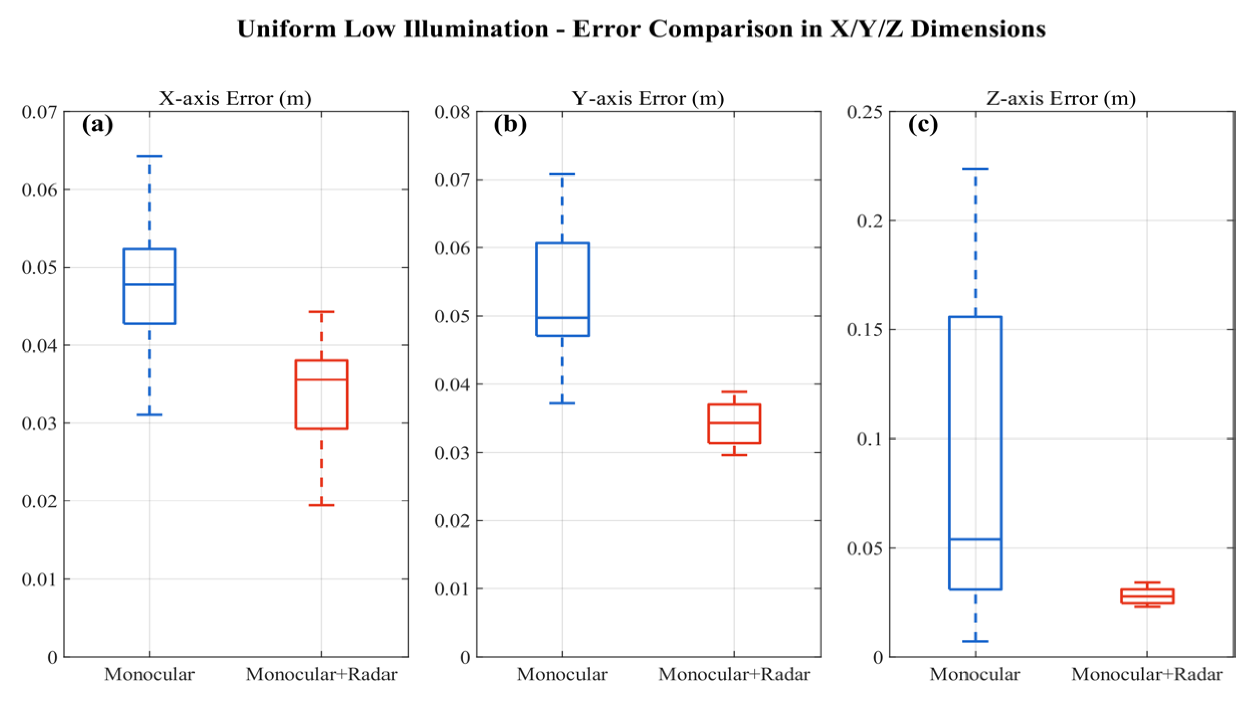 | Uniform Low Illumination | Monocular Vision | 0.0555 ± (0.0527,0.0582) | 0.0451 ± (0.0429,0.0473) | 0.0390 ± (0.0340,0.0439) |