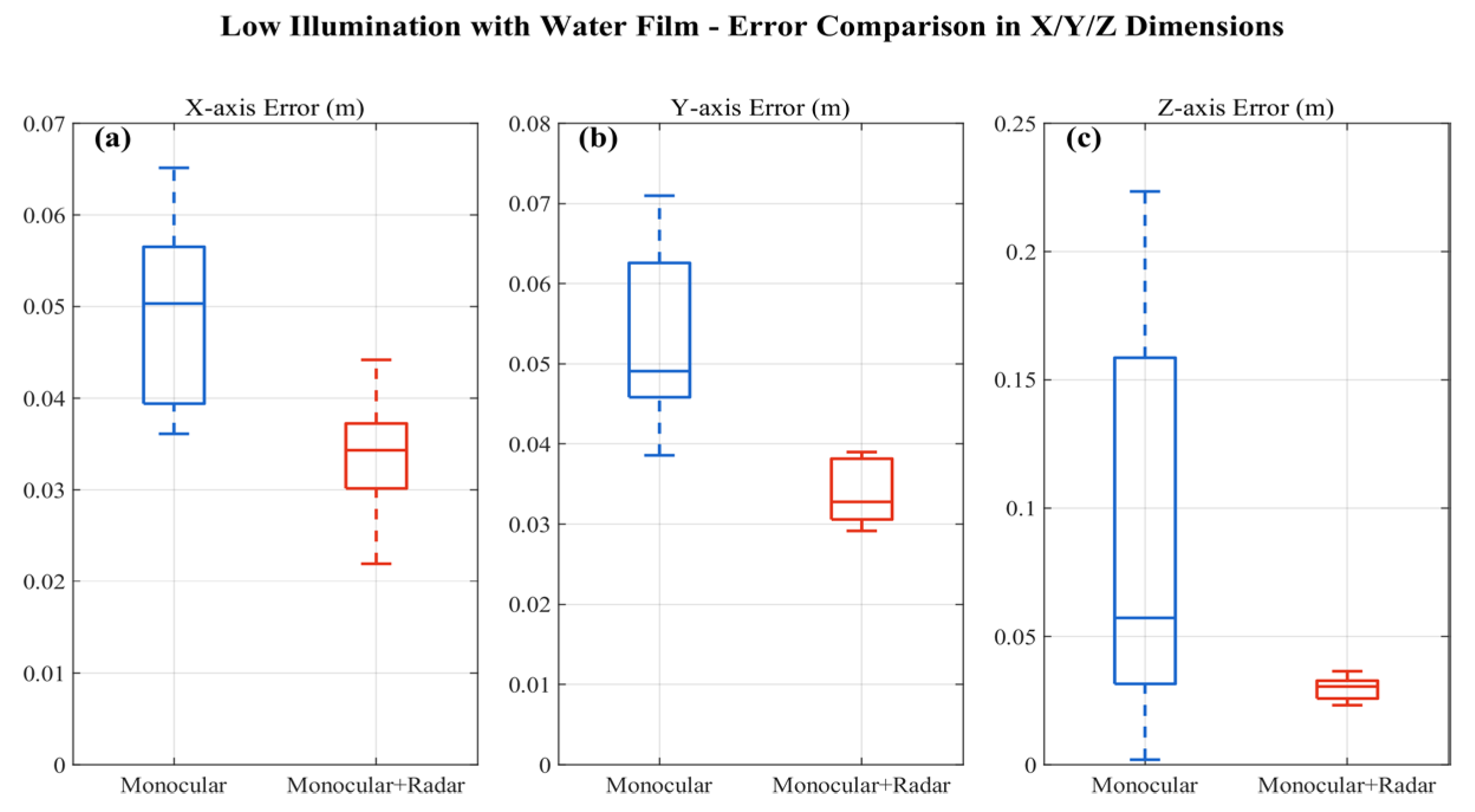 | Noise Stability (Low Illumination + Water Film) | All-axis errors remain at cm-level; Z-axis: 0.0266 m. | Error fluctuations intensified; performance degradation in some dimensions. |