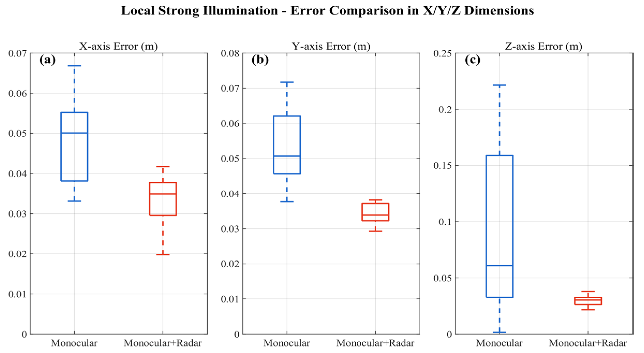 | Local Strong Illumination | Monocular Vision | 0.0450 ± (0.0422,0.0478) | 0.0525 ± (0.0501,0.0548) | 0.0674 ± (0.0520,0.0827) |