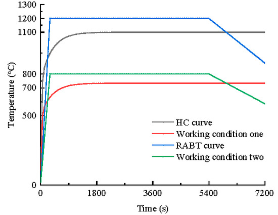 The HC curve describes the change in mechanical properties of materials or structures with time under high temperature conditions. The curve can be heated to the highest temperature after 10 min of fire, while the RABT curve describes the mechanical properties of materials or structures in the cooling stage after fire. The significant difference is that the RABT curve contains a descending section, reflecting the further degradation of mechanical properties during the cooling process, and it takes only 5 min to heat up to the highest temperature.
