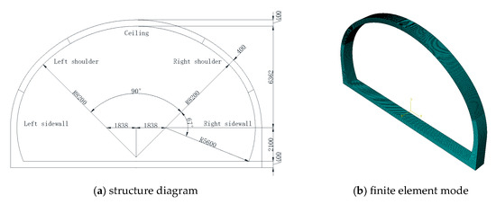 Based on the drawings of highway tunnel in practical engineering, the tunnel structure model is established. The tunnel was divided into vault, arch shoulder and side wall along the arch ring from the top of the tunnel to the left and right sides at a 30° interval to the horizontal position. Moreover, the vault is most affected by the fire, followed by the side wall, and the arch foot is basically not affected. Therefore, it is considered that the lining fire area can be identified in the range of 0–30°. This lining fire area is referenced in the temperature field model, as shown in Figure 4. In this study, the temperature field of the tunnel lining is directly represented by the temperature-time curve of the fire-exposed surface of the lining. The adopted fire curve is applied to the inner surface of the lining as a time-varying thermal boundary condition, while the remaining surfaces are assumed to be affected by the ambient temperature conditions. The temperature distribution within the lining thickness was calculated through transient heat conduction analysis, while also taking into account the heat diffusion from the exposed surface to the interior. Subsequently, the obtained temperature field is input into the mechanical analysis. The sequential coupling thermo-mechanical coupling analysis is used, allowing the influence of thermal strain and material degradation caused by temperature to be considered in the damage analysis.