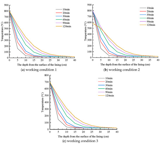The temperature curves at different positions from the lining surface under different fire time in different working conditions.