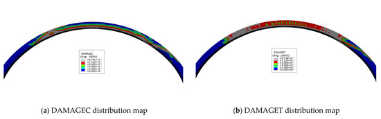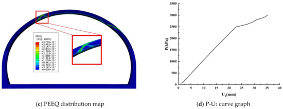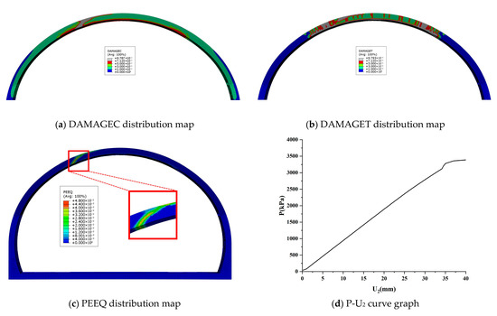The damage results of condition 7 are shown in Figure 13. When the vertical deflection of the structure reaches the limit value of 37.19 mm, the maximum value of DAMAGEC reaches 0.979, and obvious compression damage zones were formed on the left side of the lining. The volume of the severely damaged area (DAMAGEC > 0.751) is about 3.06 m3. At the same time, the maximum value of DAMAGET reaches 0.976, and the tensile damage in the upper part of the structure is more concentrated. The volume of the severe tensile damage area (DAMAGET > 0.712) is about 12.74 m3. The maximum value of PEEQ is 0.045, which is located in the upper left side of the structure, reflecting the significant plastic deformation of this part under the coupling action of high temperature and load. In addition, the P-U2 curve enters the platform stage when the pressure is about 3845 kPa, indicating that the overall stiffness of the structure decreases rapidly.