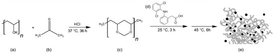 Schematic overview of the experimental workflow for PVFM preparation and diclofenac loading. (a–d) Steps of polymer synthesis, membrane casting and crosslinking at different HCl concentrations; (e) representation of the PVFM network with anchored diclofenac.