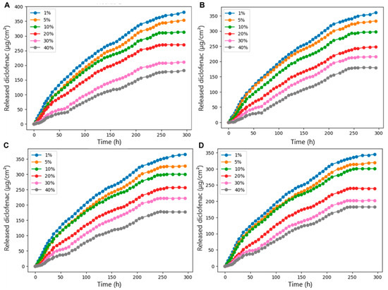Diclofenac release kinetics from PVFMs with varying degrees of crosslinking (%HCl). (A–D) Cumulative release profiles for four independent experimental replicates; each curve corresponds to a distinct HCl concentration.
