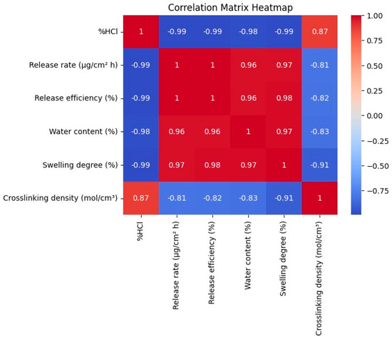 A multivariable analysis was conducted to evaluate how variations in a key factor, such as HCl concentration, simultaneously influence multiple parameters. By examining variables from Table 2, including release rate, release efficiency, swelling degree, and crosslinking density, we assessed their interdependence and combined effects on polymer performance. Figure 3 presents these relationships through a heatmap of correlation coefficients.