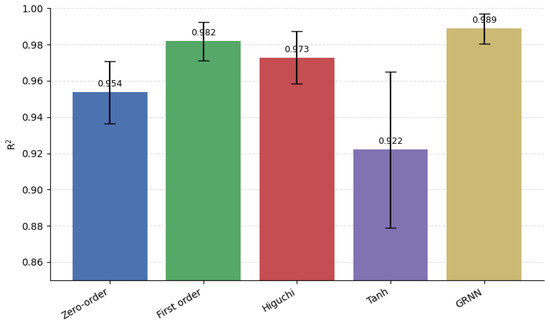 Quantitative comparison of kinetic models fitted to diclofenac release from PVFMs. Bars represent the mean coefficient of determination (R2 ± σ; n = 6 formulations) for zero-order, first-order, Higuchi, tanh and GRNN models.