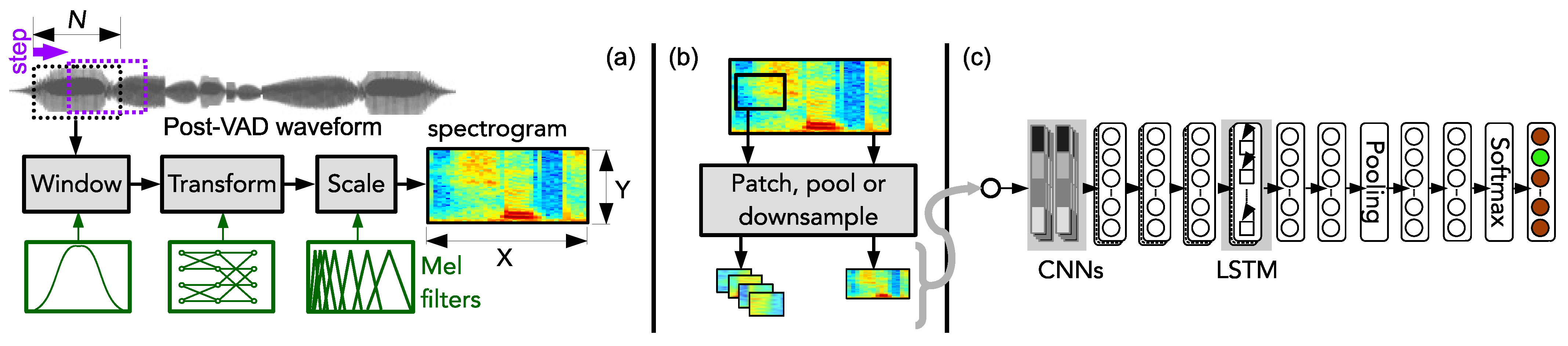 | Satt et al. [140] | LMS | ∼40–64 Mel bands, 25 ms window, 10 ms hop |