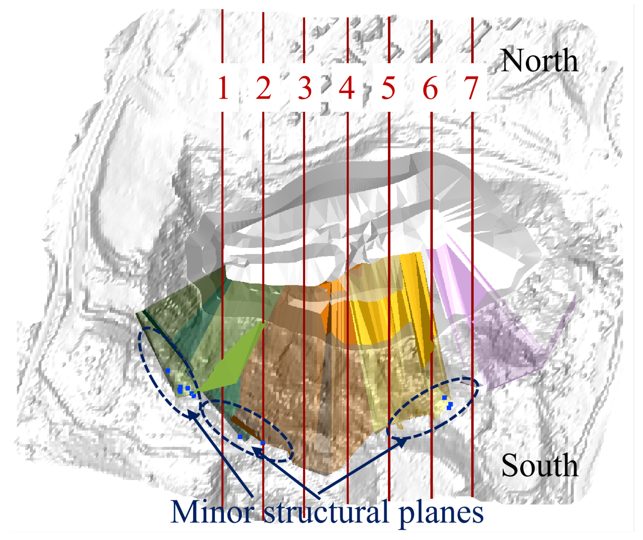 Cross-sectional layout of the slope sliding surface model. Different colors correspond to the respective main fractures.