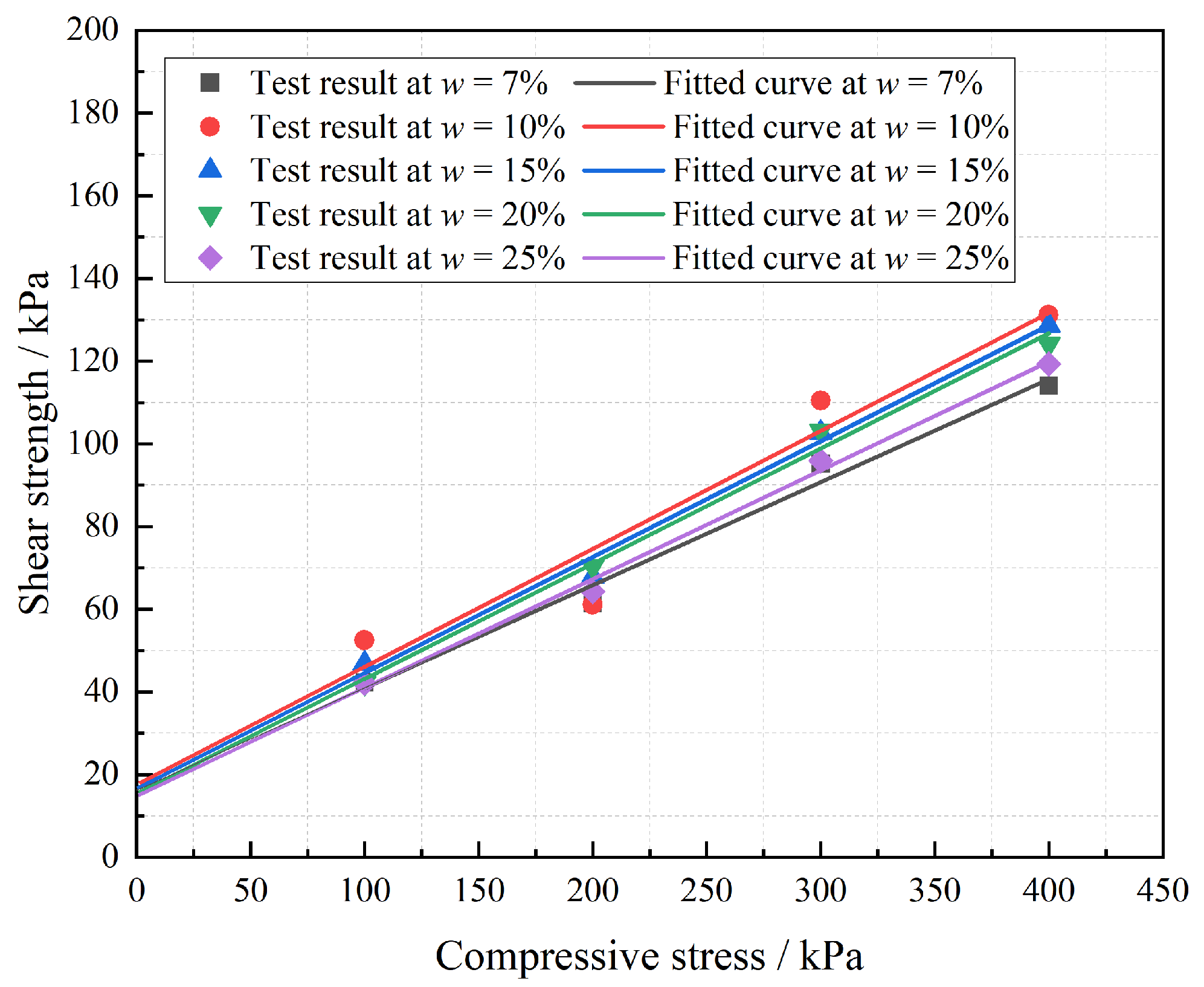 | Test ID | Water Content/% | Compressive Stress/10−3 MPa | Dial Gauge Reading of the Proving Ring/mm | Shear Strength/10−3 MPa | Cohesion/10−3 MPa | Friction Angle/° |
