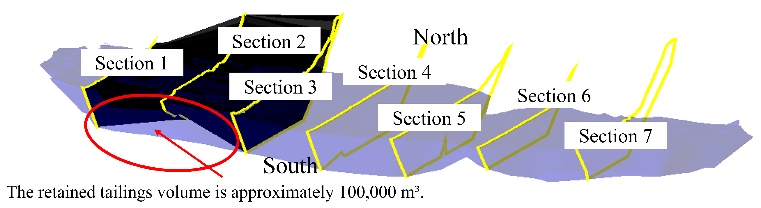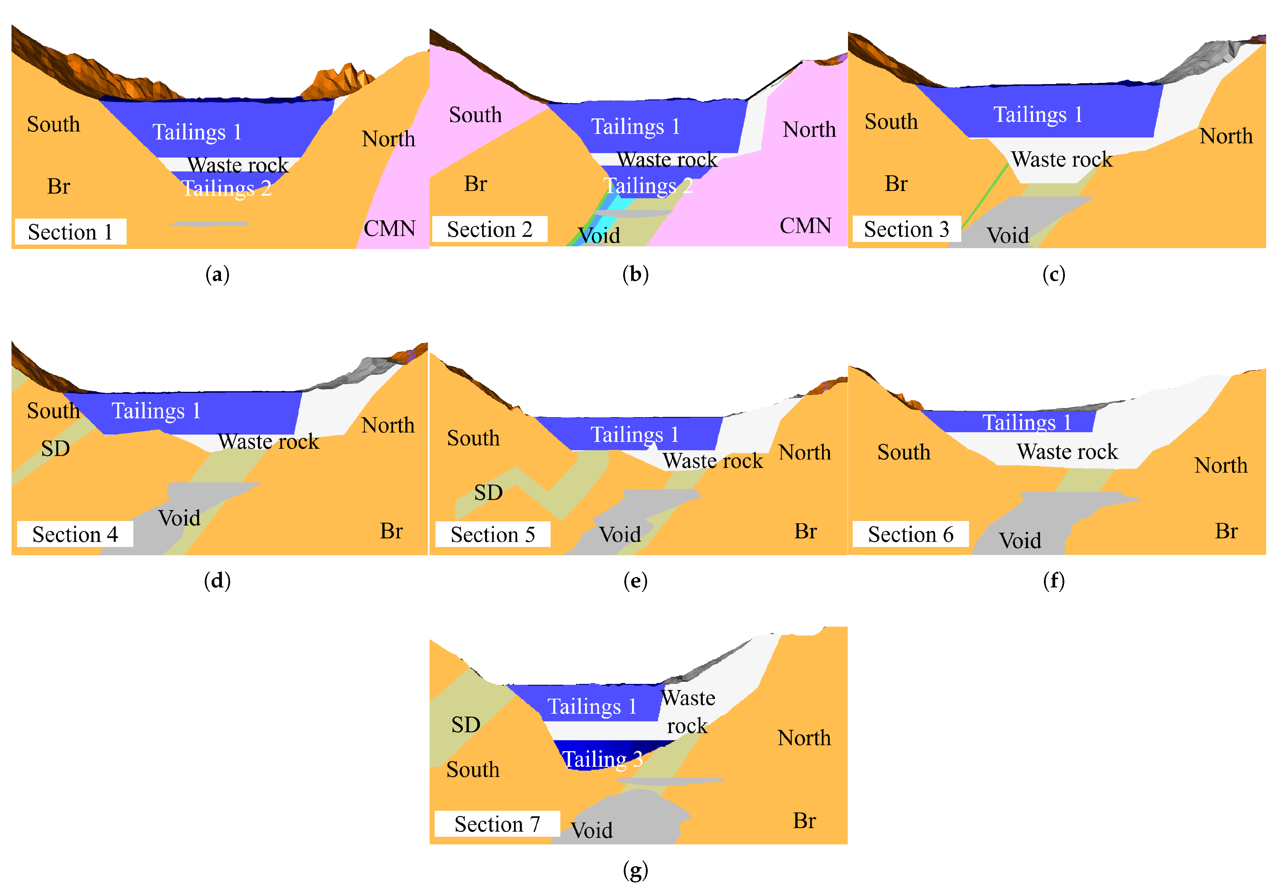 Distribution of tailings bodies and waste rock in each section. (a) Section 1. (b) Section 2. (c) Section 3. (d) Section 4. (e) Section 5. (f) Section 6. (g) Section 7. Br, CMN and SD are stratigraphic codes used to differentiate stratum of distinct geological periods.