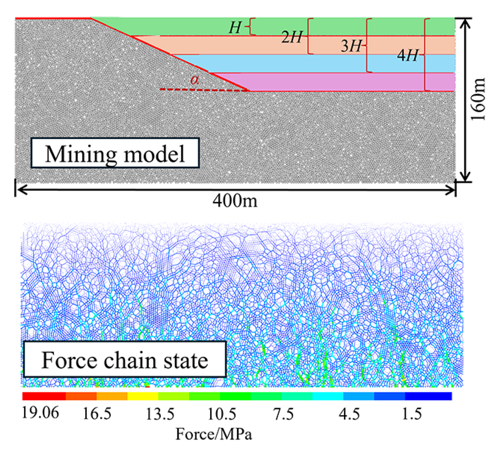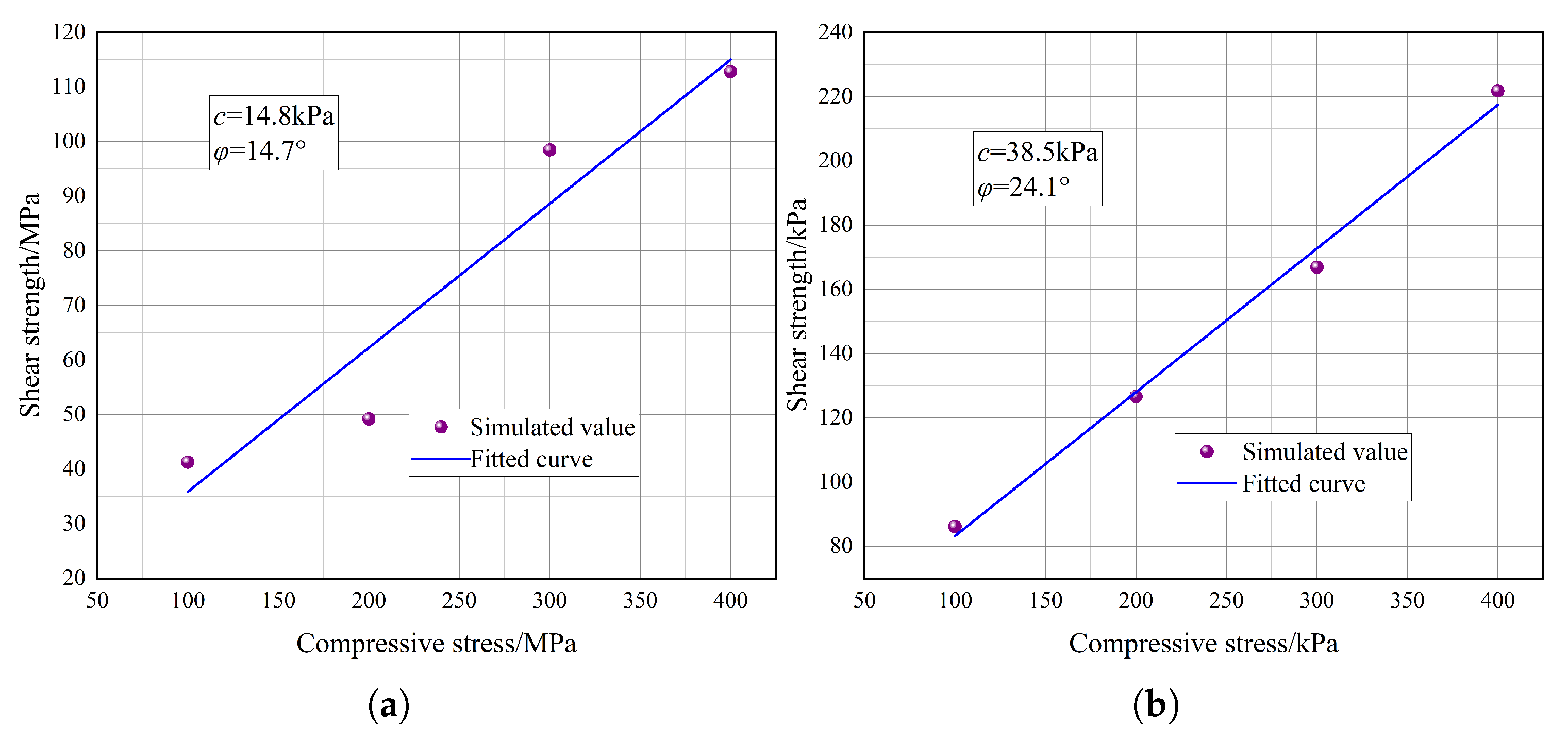 | Stratum 1 | Cohesion/MPa | Tensile Strength to Cohesion Ratio | Bond Modulus/103 MPa | Linear Modulus/103 MPa | Bond Stiffness Ratio | Linear Stiffness Ratio | Friction Coefficient | Bond Friction Angle/° |