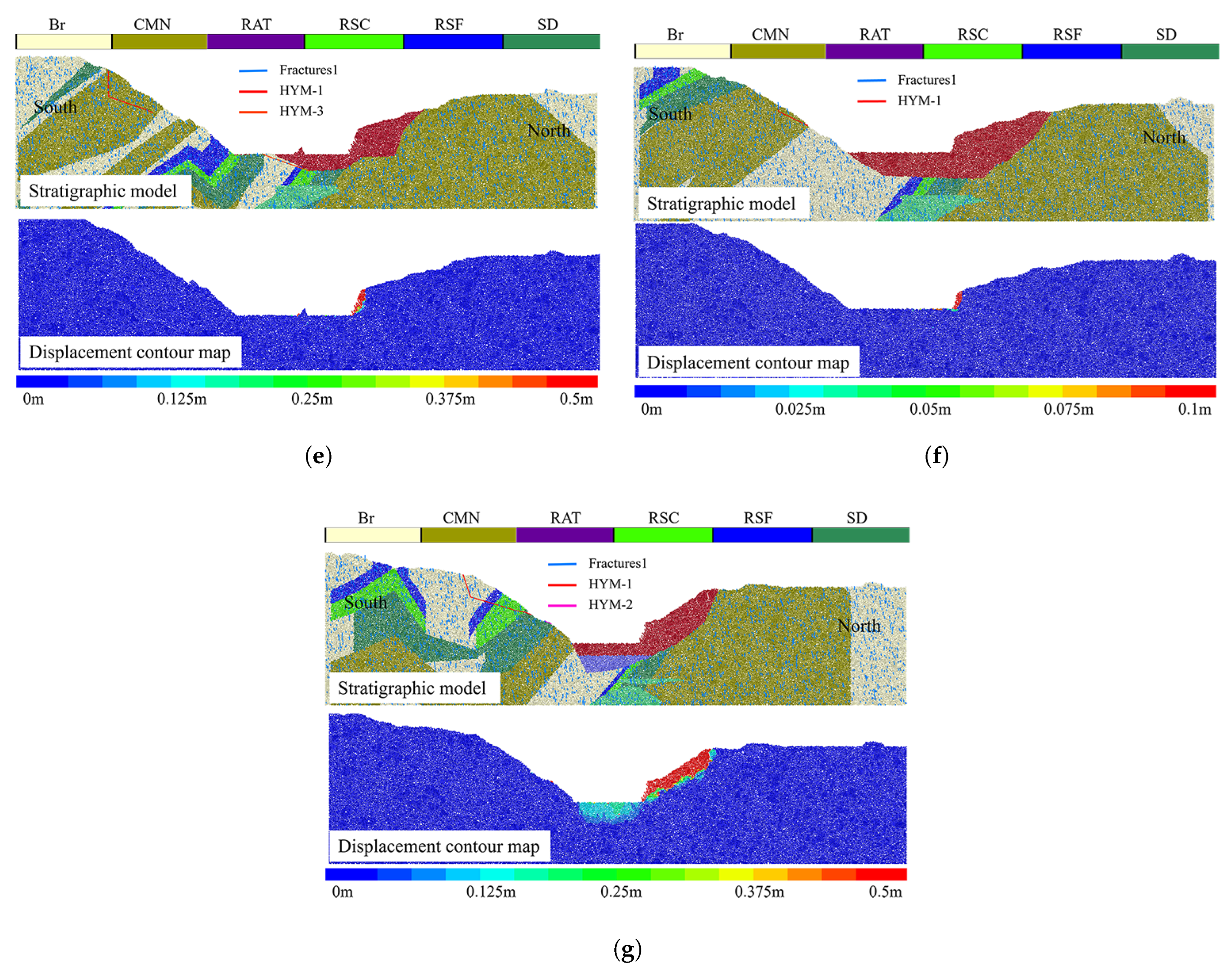 Slope stability analysis of each section after completion of tailings mining. (a) Section 1. (b) Section 2. (c) Section 3. (d) Section 4. (e) Section 5. (f) Section 6. (g) Section 7. Br, CMN, RAT, RSC, RSF and SD are stratigraphic codes used to differentiate stratum of distinct geological periods; Fractures1 represents minor fractures, while HYM-1, HYM-2 and HYM-3 represent major fractures.