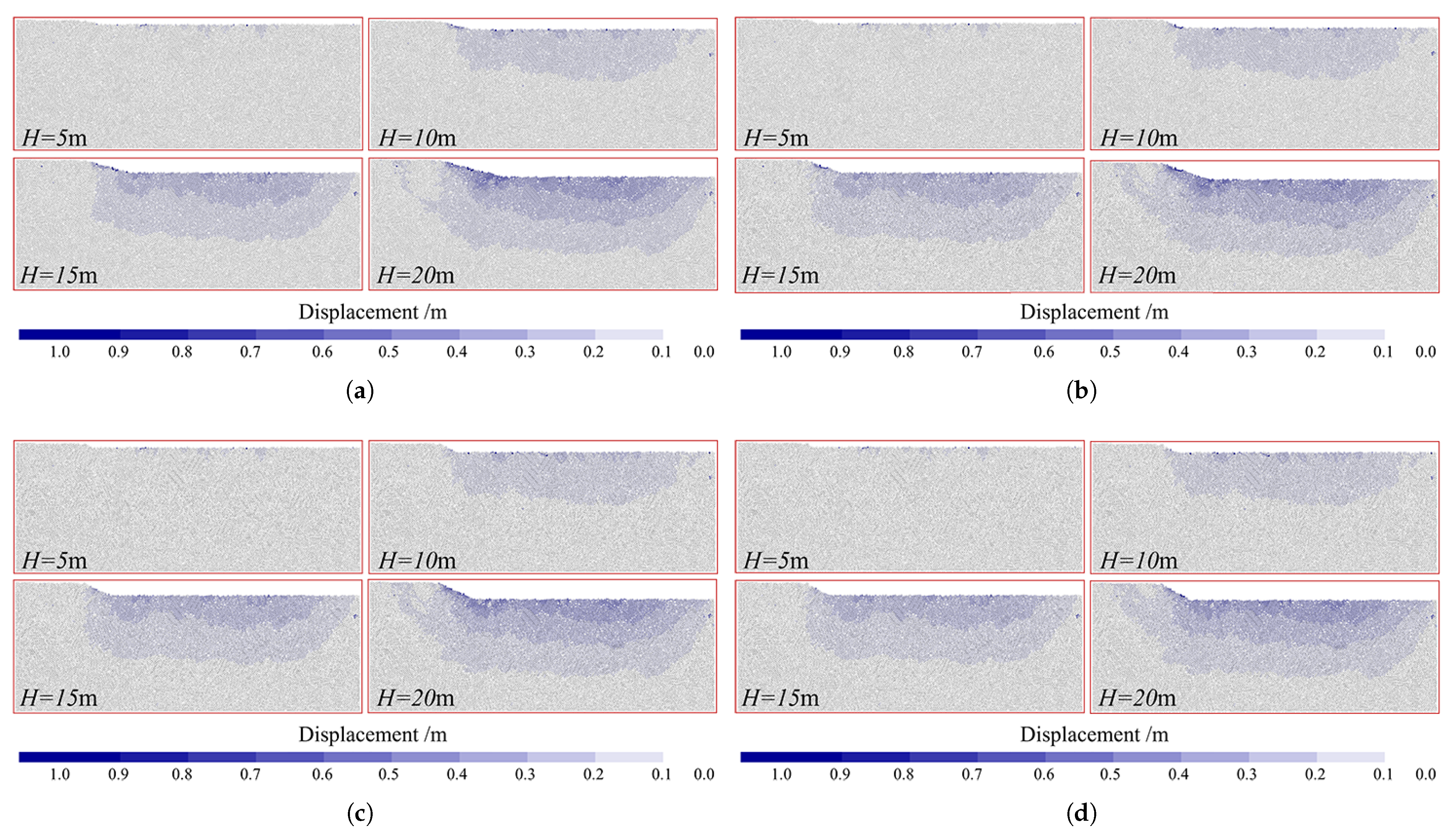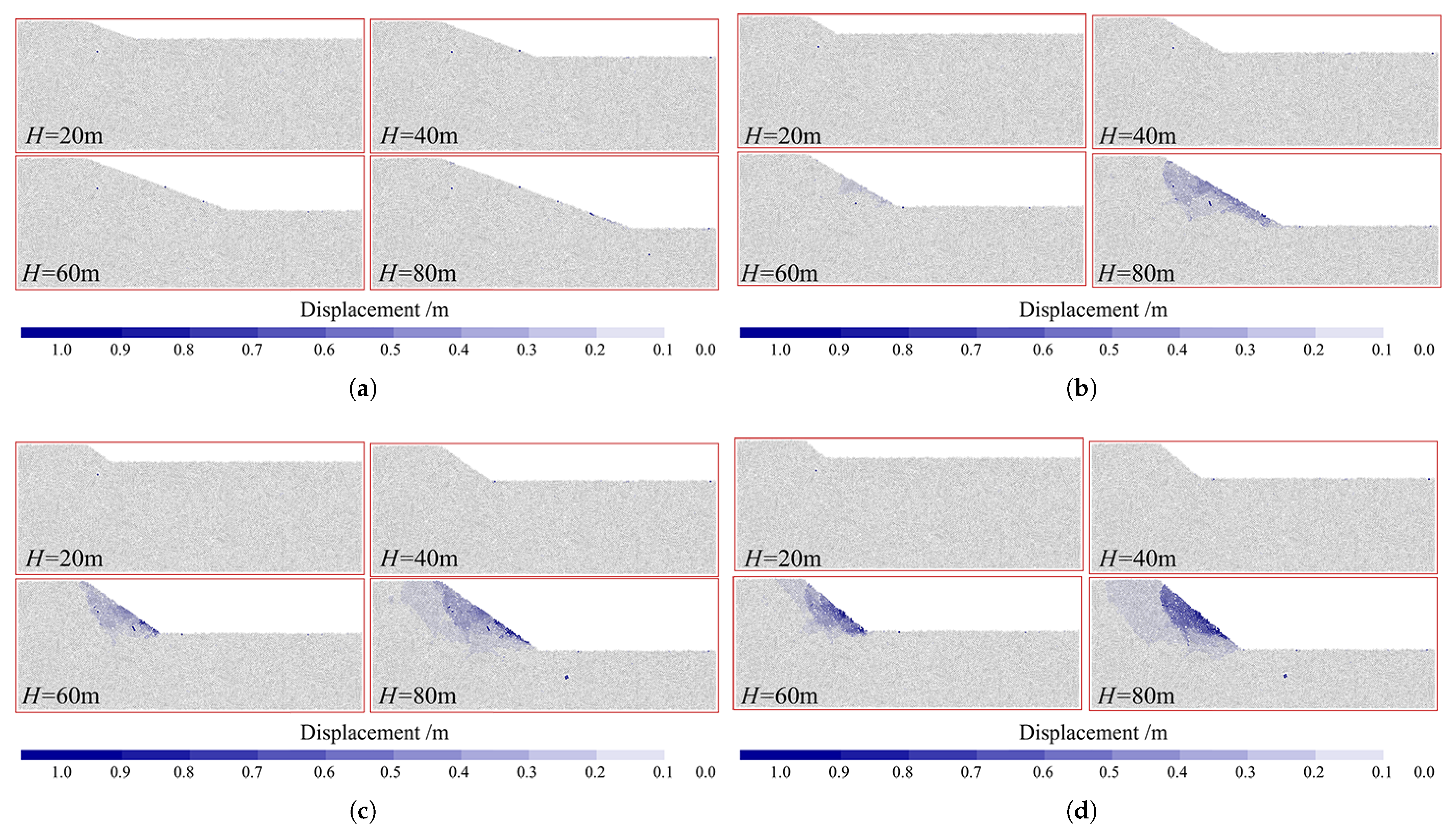Simulation results of waste rock slope deformation under varying slope angles and heights. (a) 20° slope angle. (b) 30° slope angle. (c) 35° slope angle. (d) 40° slope angle.